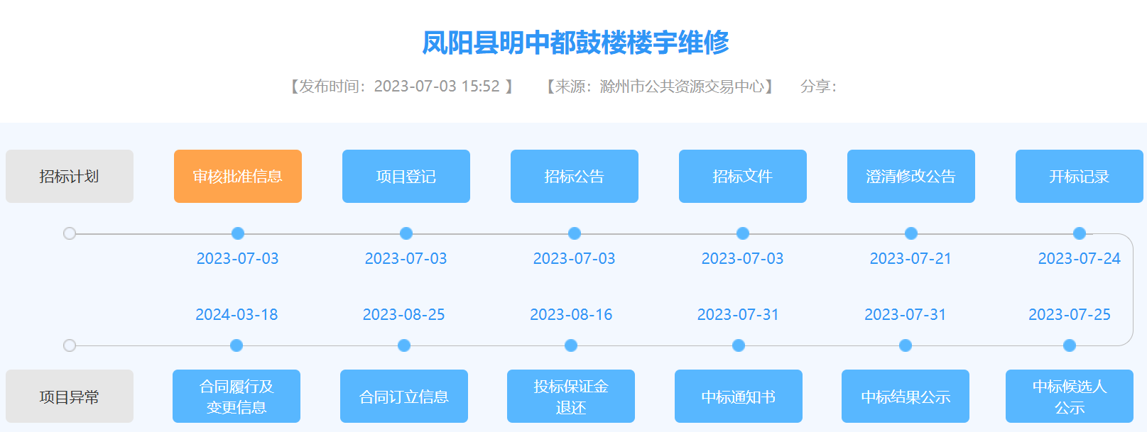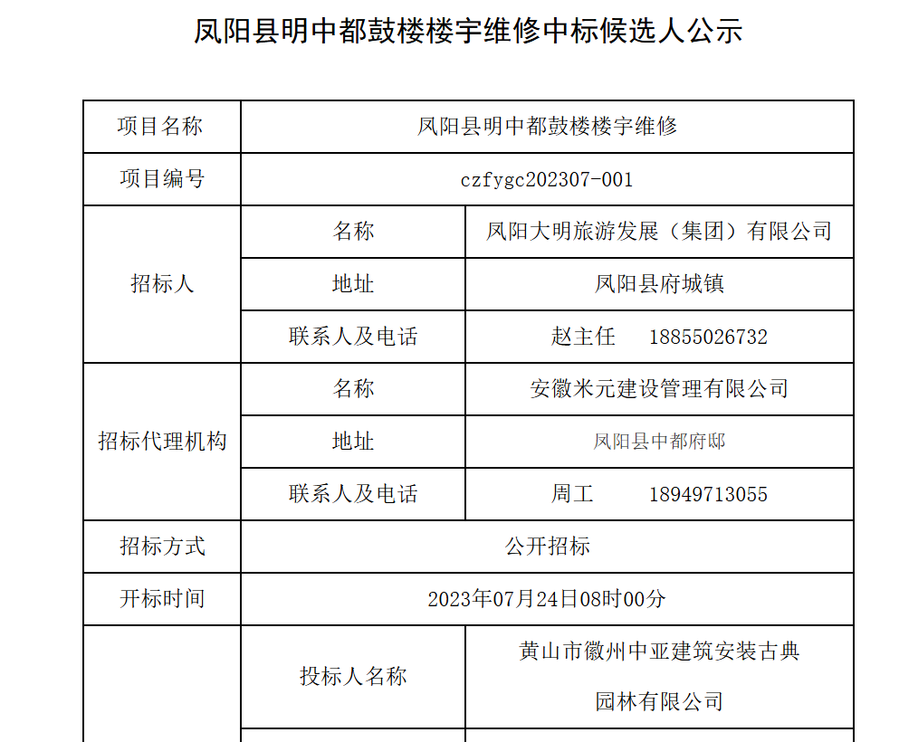 凤阳鼓楼修缮验收一年之后,屋顶瓦面大面积脱落,引发公众质疑。 凤阳鼓楼位于安徽省滁州市凤阳县,据凤阳县的消息,此前因为楼宇部分瓦片脱落等问题花费近300万元进行修缮,修缮验收工作于2024年3月完成,距今约14个月的时间。 对于外界质疑的修缮工程是否有质量问题,凤阳县文化和旅游局党组书记、局长卢德永在接受采访时表示,需要专家的论证。卢德永同时确认,脱落的瓦片在修缮范围内的。 澎湃新闻获悉,目前,国家文物局、安徽省文物局已经介入调查。 澎湃新闻记者注意到,对于修缮工程的招标时间和完成时间,凤阳县文化和旅游局公布的信息与此前的公开信息有出入。 此外,本次修缮的施工方黄山市徽州中亚建筑安装古典园林有限公司也引发关注,澎湃新闻调查发现,中亚公司曾允许无资质人员借用公司名义承接古民居修缮工程;还曾违规将自己承包的工程转包给无资质的个人。约10年前,中亚公司曾在修缮明代最大古祠堂“一本堂”期间,违规施工致祠堂失火,严重损坏。 瓦片脱落前楼宇顶部出现裂缝 凤阳鼓楼坐落在凤阳县府城镇鼓楼广场,是中都城重要附属建筑,始建于明朝洪武八年(1375年),是用来报时的建筑,与“钟楼”相配合,白天用钟声报时,夜间用鼓声报时,故有“晨钟暮鼓”一说。 凤阳鼓楼由台基和楼宇两部分组成。台基南北长72米,东西宽34.25米,高15.8米,是中国最大的鼓楼台基。基上楼宇于清咸丰三年(1853年)被火焚毁。1995年,在凤阳县政府主导下,鼓楼重建,目前已在鼓楼四周形成仿古商业旅游区。 5月21日下午,凤阳酷热,澎湃新闻记者来到事故现场。位于凤阳县旧城区的明中都鼓楼已经被围挡遮蔽,多名建筑工人正在现场清理瓦砾和其他建筑垃圾。 ![]() 5月19日晚间,多条“凤阳鼓楼塌了”的视频在网上流传,引发关注。当晚,凤阳县文化和旅游局发布情况通报:5月19日下午6时30分许,凤阳县鼓楼楼宇(1995年重建)顶部一侧瓦片部分脱落,无人员伤亡。相关情况正在调查中。 5月19日当天,鼓楼所属单位凤阳大明旅游发展(集团)有限公司发布通告称:因鼓楼楼宇屋面局部瓦片脱落,自2025年5月20日起封闭维修,开放时间另行通告。 5月20日,凤阳鼓楼瓦片脱落仍旧引发诸多质疑,为何修缮短短一年瓦片即再次脱落、当初的招投标是否合规等等。 面对质疑,5月20日,凤阳县文化和旅游局再次发布鼓楼楼宇瓦片脱落情况通报。通报介绍,2017年以来,鼓楼楼宇零星出现屋顶部分瓦片脱落、檐板损毁。 通报显示,凤阳县委、县政府已成立调查组,责令项目设计单位、施工单位、监理单位赶赴现场,并邀请相关专家开展调查核实。 对于维修,通报显示,2023年2月,因损毁情况加重,存在安全隐患,启动鼓楼楼宇维修项目。2023年5月,通过公开招标,确定了项目设计单位、施工单位、监理单位。2023年9月进场施工,2024年3月竣工验收。 在此次瓦片脱落之前5个月,其实已经发现问题。据央广网报道,修缮验收仅仅9个月后,同年12月,无人机巡检时发现楼宇顶部南北向出现裂缝。第三方检测机构评估后要求施工单位进行修补,当时的结论是“没有整体滑动现象”。 楼宇修缮是否是工程质量问题?凤阳县文化和旅游局党组书记、局长卢德永在接受央广网采访时表示,“需要专家的论证。” 公众另一个疑问则是此次脱落的瓦片是否为新修缮的部分,卢德永在接受澎湃新闻采访时表示,是修缮范围内的。卢德永还表示,当时修补主要是三大块:重点是在顶部,顶部的瓦面需要更换;第二个是二楼的栏杆,原来是栏杆高度矮了,达不到安全的要求,另外它有一点松动;第三个是檩条有损坏的地方,经检测是损坏的,那就把檩条更换了。 此外,5月19日,央视网报道称,从文物部门获悉,凤阳鼓楼的楼宇部分并不是文物,而是1995年未经批复,就违规复建的“假古董”,属于违规建筑。5月20日,凤阳县文化和旅游局相关负责人在接受澎湃新闻采访时称,“鼓楼楼宇1995年建设,履行了相关报批手续。” 有媒体报道,该建筑于1995年履行相关报批手续时,在安徽省文物局就未获得批准,属于违规建筑。 5月20日晚间,在接受澎湃新闻记者采访时,凤阳县文化和旅游局相关负责人已经做出澄清。“凤阳县主管部门于1994年12月报批,安徽省文物局于1995年1月批准。”不过,凤阳县文旅局并未就这一说法提供报批文件证明。 时间节点疑云:官方通报确定施工单位时还未开启招标? 凤阳文化和旅游局公布的招标时间与公开信息显示的招标时间和验收时间不一致。 凤阳县文旅局称,2023年5月,通过公开招标,确定了项目设计单位、施工单位、监理单位。2023年9月进场施工,2024年3月竣工验收。 但是,澎湃新闻从滁州市公共资源交易中心查询到的时间点则显示,凤阳县发展和改革委员会批准《凤阳县明中都鼓楼楼宇维修》招标计划的时间为2023年7月3日。这份2023年7月3日发布的文件显示,招标单位为凤阳大明旅游发展(集团)有限公司,监管单位为凤阳县发改委。 招标内容为:鼓楼楼宇重檐歇山顶屋面维修,更换损毁檐板、屋椽及脱落瓦片,斗拱、门窗油漆翻新,二楼栏杆加高等;招标估算金额400万元。 ![]() 来源:滁州市公共资源交易中心官方网站 2023年7月24日,此次招标开标。合计31家企业参与投标,报价款最高的为374.25万元,最低的为307.88万元。2023年7月25日公布的中标候选人公示显示,报价为341.21万元的黄山市徽州中亚建筑安装古典园林