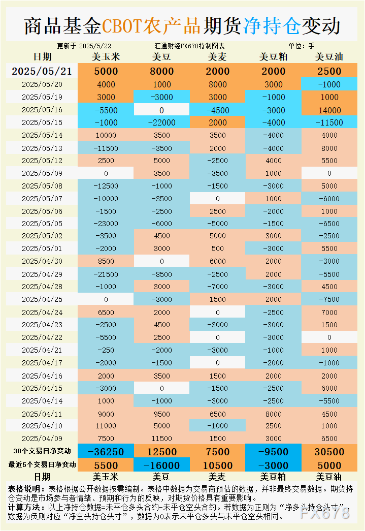周四(5月22日),CBOT谷物期货市场呈现震荡偏弱格局,主力合约涨跌互现。美小麦(ZW1)下跌0.73%,报5.452美元/蒲式耳;美大豆(ZS1)下跌0.89%,报10.532美元/蒲式耳;美玉米(ZC1)下跌0.49%,报4.586美元/蒲式耳;美豆油大幅下挫近4%,报47.99美分/磅;美豆粕则逆势上涨0.65%。近期市场情绪受到多重因素驱动,包括阿根廷洪涝灾害引发的供给担忧、美国中西部天气预报、美元走弱以及大宗商品基金的持仓调整。叠加特朗普关税言论引发的避险情绪,市场波动加剧。本文将基于最新持仓变动数据,结合基本面和市场情绪,分析小麦、大豆、豆油、豆粕、玉米的市场动态,并展望未来走势。 ![]() 根据汇通财经数据,5月21日大宗商品基金增加CBOT小麦投机性净多头2000手,最近5个交易日净多头增加10500手,显示基金在短期内对小麦价格持谨慎乐观态度。然而,近30个交易日净多头仅增加7500手,反映长期看涨信心不足。市场情绪受到多方面影响:一是俄乌局势和北方半球主产国(如中国、俄罗斯)产量不确定性,二是美元走弱降低美国小麦出口成本,刺激短线买盘。知名机构分析师Mike Zuzolo指出,全球小麦需求回暖及中国、俄罗斯潜在减产担忧推动短线空头回补,价格一度触及4月21日以来高点5.5625美元/蒲式耳。 美国小麦作物评级意外下降,叠加俄乌局势引发的供给担忧,支撑了近期价格反弹。然而,基差数据显示,5月装船的CIF小麦驳船报价较CBOT7月合约溢价仅63美分/蒲式耳,较前日下跌1美分,表明现货市场需求相对平稳,出口竞争加剧。USDA出口销售预期显示,2024/25年度小麦出口净销售预计为-20至10万吨,2025/26年度为30至70万吨,反映出口需求短期偏弱但新年度预期改善。 小麦期货短期受空头回补和美元走弱支撑,可能延续震荡偏强格局,关键阻力位在5.60美元/蒲式耳附近。但长期看,全球供给压力和出口竞争可能限制上行空间,需关注USDA周度出口销售数据和俄乌局势进展。 大豆:阿根廷减产担忧支撑反弹,持仓转向净空 5月21日,基金增加CBOT大豆投机性净多头8000手,但近5个交易日转为净空头16000手,显示市场情绪从看涨转为谨慎。过去30个交易日净多头增加12500手,表明长期看涨情绪仍存,但短期波动加剧。阿根廷暴雨引发的减产担忧推动投机基金回补空单,7月合约一度创近一周高点。然而,布宜诺斯艾利斯谷物交易所报告称,未来几天干燥天气将缓解洪涝影响,削弱供给担忧的持续性。 美国中西部播种延迟,叠加阿根廷洪涝灾害,支撑大豆价格短期走强。CIF大豆驳船5月装船报价较CBOT7月合约溢价63美分/蒲式耳,6月报价68美分/蒲式耳,显示现货市场对近月需求支撑较强。USDA出口销售预期显示,2024/25年度大豆出口净销售为10至30万吨,2025/26年度为9至40万吨,反映出口需求平稳但受关税言论影响存在不确定性。国内豆粕现货价格低估,近期累计跌幅较大,市场进入价值修复阶段。 大豆期货短期受阿根廷减产预期和空头回补支撑,可能在10.50至10.80美元/蒲式耳区间震荡。若阿根廷天气好转或USDA出口数据不及预期,价格可能承压回落。关注现货基差变化和美国中西部天气预报。 豆油:供需压力显现,持仓增量难掩下行趋势 5月21日,基金增加CBOT豆油投机性净多头2500手,近5个交易日净多头增加5000手,过去30个交易日净多头增加30500手,显示长期看涨情绪较强。然而,豆油期货5月22日大幅下跌近4%,报47.99美分/磅,反映市场对供应压力的担忧。国内豆油现货成交量近期显著回升,5月21日成交65800吨,环比增加64.50%,但基差报价走弱,显示现货市场情绪偏谨慎。 美国中西部加工厂因维护停机导致豆油供应短期趋紧,但南美大豆丰产及国内夏季大豆集中到港,压制豆油价格。FOB出口溢价6月装船报价较CBOT7月合约溢价77美分/蒲式耳,持平前日,表明出口需求稳定但无明显增量。USDA预期2024/25年度豆油出口净销售为0至2.2万吨,显示出口动能有限。国内油脂市场跳空低开,棕榈油和菜油价格走弱,进一步拖累豆油。 豆油期货短期受供应压力和市场情绪波动影响,可能延续弱势,支撑位在46.50美分/磅附近。中期看,南美供给充裕及国内压榨量增加将限制上行空间,需关注USDA出口数据和油脂市场联动性。 豆粕:现货低估支撑反弹,持仓减量反映观望情绪 5月21日,基金增加CBOT豆粕投机性净多头2000手,但近5个交易日净空头增加3000手,过去30个交易日净空头增加9500手,显示市场情绪偏向观望。国内豆粕2509合约收涨1.91%,报2934元/吨,反映阿根廷洪涝灾害和美国大豆通关受阻的短线利好。华联期货指出,豆粕市场短期或宽幅震荡,支撑位在2850元/吨附近。 国内豆粕现货成交量波动较大,5月21日成交36.74万吨,较前日减少52.21万吨,显示现货市场活跃度下降。广东贸易商豆粕现货基差报价-20,反映价格低估后的修复需求。USDA预期2024/25年度豆粕出口净销售为10至40万吨,显示出口需求平稳但受关税言论影响存在不确定性。阿根廷减产预期和美国中西部天气利好为豆粕提供支撑。 豆粕期货短期受现货低估和阿根廷供给担忧支撑,可能在当前价位附近震荡,上方阻力在3000元/吨。长期看,南美供给压力和国内压榨量增加可能限制涨幅,需关注USDA出口数据和现货成交变化。 玉米:持仓增量支撑反弹,全球供需趋紧提供动能 5月21日,基金增加CBOT玉米投机性净多头5000手,近5个交易日净多头增加5500手,但过去30个交易日净空头增加36250手,反映短期看涨情绪增强但长期偏空格局未变。市