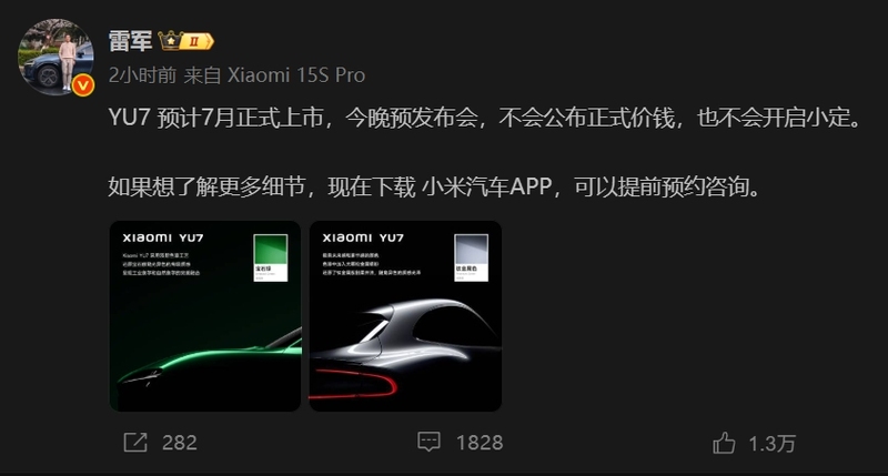 5月22日,小米集团董事长雷军在微博上发文称,YU7预计7月正式上市,5月22日晚预发布会,不会公布正式价钱,也不会开启小定。