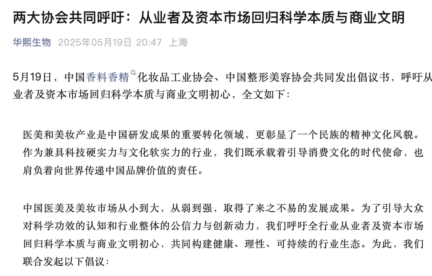A股医美龙头企业华熙生物近期对多家券商研报呛声,引发越来越多关注。 华熙生物通过官方微信公众号发布近5000字长文《概念总在重演,科技永远向前》,直指9家券商的10篇研究报告存在“科学误导”与“资本炒作”问题。 昨晚又出新剧情,华熙生物在5月21日晚间再度发文指出,透明质酸(HA)与胶原蛋白都是人体重要物质,二者互动构成细胞外基质ECM功能核心,存在信号共生、力学共生、病理共损三重关系。全球范围内透明质酸在衰老等方面研究和论文证据更多,且证据显示其对胶原蛋白有先导牵引作用。目前科研证据等级表明,重组胶原蛋白在颜值与生命衰老干预底层机制上未显关键地位,证据未达透明质酸对衰老管理的作用等级。 ![]() 而在此前的5000字的长文长文中,华熙生物指控称,相关研报不仅混淆“人体内胶原蛋白”与“重组胶原蛋白产品”概念,且结论缺乏第三方论证、忽视权威期刊研究及药监局审批数据对比,甚至被自媒体传播引发“舆论共振”,导致玻尿酸产业信心受挫。 值得关注的是,作为全球玻尿酸产业龙头,华熙生物2024年净利润同比降70%,而被研报热捧的重组胶原蛋白赛道企业巨子生物同期净利润增长42%,控诉行为被质疑是“转移业绩压力”的自救。 而从券商角度来看,研报叙事更偏向市场趋势和投资逻辑导向,研报中对比玻尿酸与重组胶原蛋白的表述,意在为投资者提供差异化的行业分析,反映当前生物材料领域的竞争格局变化。 这场罕见的“炮轰”引发资本市场热议,事件背后,是科学话语权与资本叙事的激烈碰撞,科学严谨性应如何与市场前瞻性平衡成为核心关注。此外,券商研报在数据引用、论证逻辑及行业专业性上是否存在漏洞,也成为讨论焦点。 华熙生物炮轰券商研报,直指两大问题 5月17日晚,华熙生物通过官方微信公众号发布了一篇言辞激烈的文章——《概念总在重演,科技永远向前》。在这篇文章中,华熙生物点名了包括华泰证券、安信证券、西部证券、国金证券等在内的9家券商共10篇研究报告,控诉这些报告中关于重组胶原蛋白优于玻尿酸的表述为误导性“结论”。 记者发现,目前华泰证券、平安证券、西部证券、华福证券相关研报在Wind平台已检索不到,信达证券、方正证券、安信证券、申港证券、国金证券研报仍可查阅,值得注意的是,这些研报的发布时间集中在2023年。 ![]() 华熙生物控诉券商研报存在两大问题:科学依据不足与资本驱动的概念炒作。根据其披露,9家券商在围绕上市公司巨子生物的研报中,大量引用“胶原蛋白优于玻尿酸”的结论,例如“重组胶原蛋白安全性更高”“玻尿酸存在交联剂残留风险”等。 华熙生物认为,这些结论缺乏第三方专业论证,既无公开论文或国内外研究支撑,也罔顾国家药监局相关产品的审批证书数量的基本结果对比,甚至将人体内胶原蛋白与重组胶原蛋白产品混为一谈,构成“科学误导”。 华熙生物进一步指出,此类研报结论被自媒体和社交媒体广泛传播,形成资本市场与消费市场的“舆论共振”,导致投资者和消费者对玻尿酸产业的信心受损。其矛头直指券商研报背后的资本逻辑:“浮躁资本为追逐新题材,刻意构建‘玻尿酸过时论’,试图用‘概念切换’掩盖中国产业升级的真实需求”。 华熙生物的愤怒并非毫无缘由。从行业地位来看,透明质酸产业中,中国占据着全球第一份额的优势地位,而华熙生物又是国内该领域的龙头企业。历经多年发展,透明质酸在科研、医疗、医美、美妆、营养健康等多个生命健康相关领域都有着广泛且深入的应用。 但近年来,随着资本市场热点的转移,重组胶原蛋白概念兴起,越来越多的声音将玻尿酸描述为“过时”“不如重组胶原蛋白安全”“生物活性低”“市场价值逊色”等,这对华熙生物以及整个透明质酸产业而言,无疑是沉重打击。 华熙生物方面透露,目前已就多家券商研报中“枉顾科学事实的内容”向证监会反映。据华熙生物称,华福证券、西部证券等已删除其在WIND上发布的“被点名”研报。不过,华熙生物也指出,研报虽已删除,但造成的恶劣影响远远没有消除。 冲突根源:科学严谨性和资本叙述逻辑的碰撞 华熙生物对券商研报的质疑,实际上是科学严谨性与资本叙事之间的冲突。 华熙生物的核心质疑是,这些券商研报在行业研究中严谨性、专业性、独立性缺失。一是论证过程缺乏严谨性在阐述胶原蛋白在医美领域的修复功效强于玻尿酸时,没有提供足够多的临床案例数据、实验对比数据来支撑。二是玻尿酸和胶原蛋白在结构、功能、应用场景及安全性等方面各有特点,不能简单判定谁优谁劣,研报中对玻尿酸的片面评价,显示出对玻尿酸在医美领域多元化应用及科技研发进展缺乏深入了解。三是研报结论或受资本热点驱动影响,甚至为其他企业站台,形成了资本市场与消费市场舆论共振,沦为资本叙述工具。 而从券商角度来看,研报叙事更偏向市场趋势和投资逻辑导向,聚焦重组胶原蛋白市场潜力。记者翻阅了尚能查看的几篇研报,其对于“透明质酸”“玻尿酸”和“重组胶原蛋白”的表述如下: 信达证券:与透明质酸钠相比,活性胶原蛋白本身可为皮肤提供胶原蛋白,达到支撑作用,同时刺激成纤维细胞产生胶原蛋白,增强肌肤弹性,达到抗衰效果。 国金证券:玻尿酸和胶原蛋白都是抗衰老的注射材料,胶原蛋白塑形效果