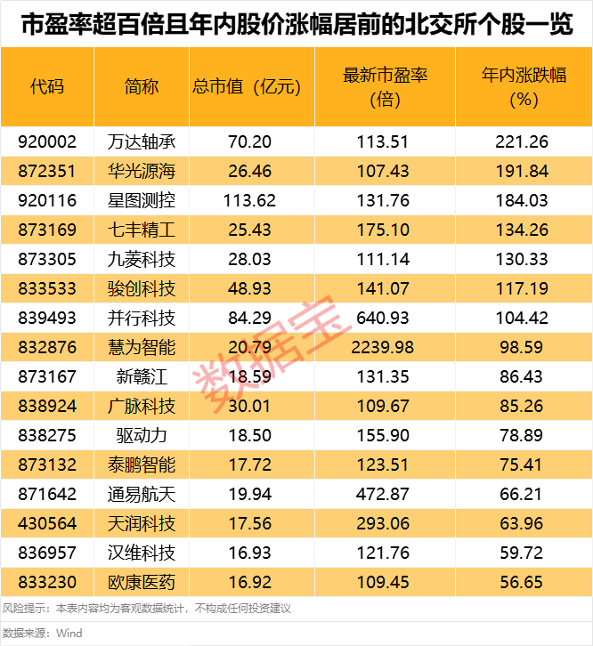 近期持续强势的北交所股票突然下跌。 今日(5月22日)市场震荡调整,银行股逆市走强,浦发银行、江苏银行、成都银行等多只银行股创历史新高。保险、多模态AI(人工智能)、氮化镓等板块涨幅居前;宠物经济、美容护理、固态电池、食品饮料等板块跌幅居前。 北证50指数跌超6% 北证50指数今日午后跌幅有所增大,最终收跌6.15%。北证50成份股锦波生物跌幅居首,今日股价下跌14.55%;五新隧装、XD森萱医、诺思兰德等个股跌幅居前,均跌超7%。 ![]() 从跌幅居前的北证50成份股来看,不少个股年内收获较大涨幅;有些个股年内涨幅甚至超100%,例如锦波生物、民士达、并行科技等,个股股价今日下跌有消化前期较大涨幅的嫌疑。 据证券时报·数据宝统计,目前A股年内涨幅居前的20名个股年内平均涨幅达207.76%;分板块来看,这20只个股,来自北交所的个股数量占6只,来自创业板和主板的个股分别占7只和6只,科创板占1只。 ![]() 年涨幅最高的为*ST宇顺,年内累计上涨308.43%。5月20日晚间,*ST宇顺曾披露公告称,公司申请自5月21日起停牌核查,预计停牌时间不超过3个交易日。停牌核查的原因是,*ST宇顺股票自2025年3月31日至5月20日涨幅达204.18%,在此期间该股总共拉出26个涨停。 涨幅排第二的是联合化学,该股年内累计涨幅298.34%,公司的主营业务为偶氮类有机颜料、挤水基墨的研发、生产与销售。 超95%北交所个股年内均录得上涨 目前市场266只北交所个股中,仅11股年内股价下跌,其余个股年内均录得上涨,占比高达95.86%,其中171只个股年内涨幅超30%,堪称年内最牛板块。 一致魔芋年内股价累计上涨225.45%,居首。该股今日股价下跌9.87%,成交额4亿元,换手率11.76%。 万达轴承年内股价累计上涨221.26%,排名第二。该股今日微涨0.26%,5月21日,万达轴承融资净偿还438.34万元,净偿还额创2025年4月16日以来新高。 从估值来看,目前北交所个股中有70股的最新市盈率超百倍,占比26.32%。慧为智能的市盈率最高,达2239.98倍,该股年内股价累计上涨98.59%。并行科技的市盈率达640.93倍,该股年内股价累计上涨104.42%;并行科技5月22日披露,公司805.76万股限售股将于5月26日起上市流通,占总股本的13.84%,按最新收盘价计算,解禁市值为11.66亿元,此次解禁股份类型为首发原股东限售股份,发行价格为29元。 有分析认为,微盘股过于拥挤可能是北交所板块下跌的主因,中证2000指数的成交占比已经超过了3月的高点,微盘出现了显著的超买信号。 ![]() (文章来源:数据宝) |