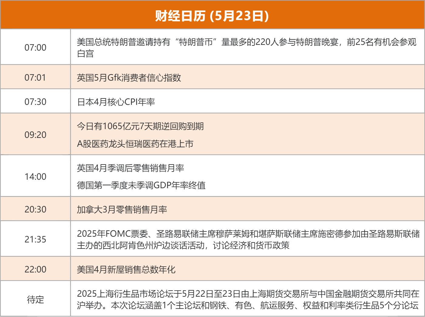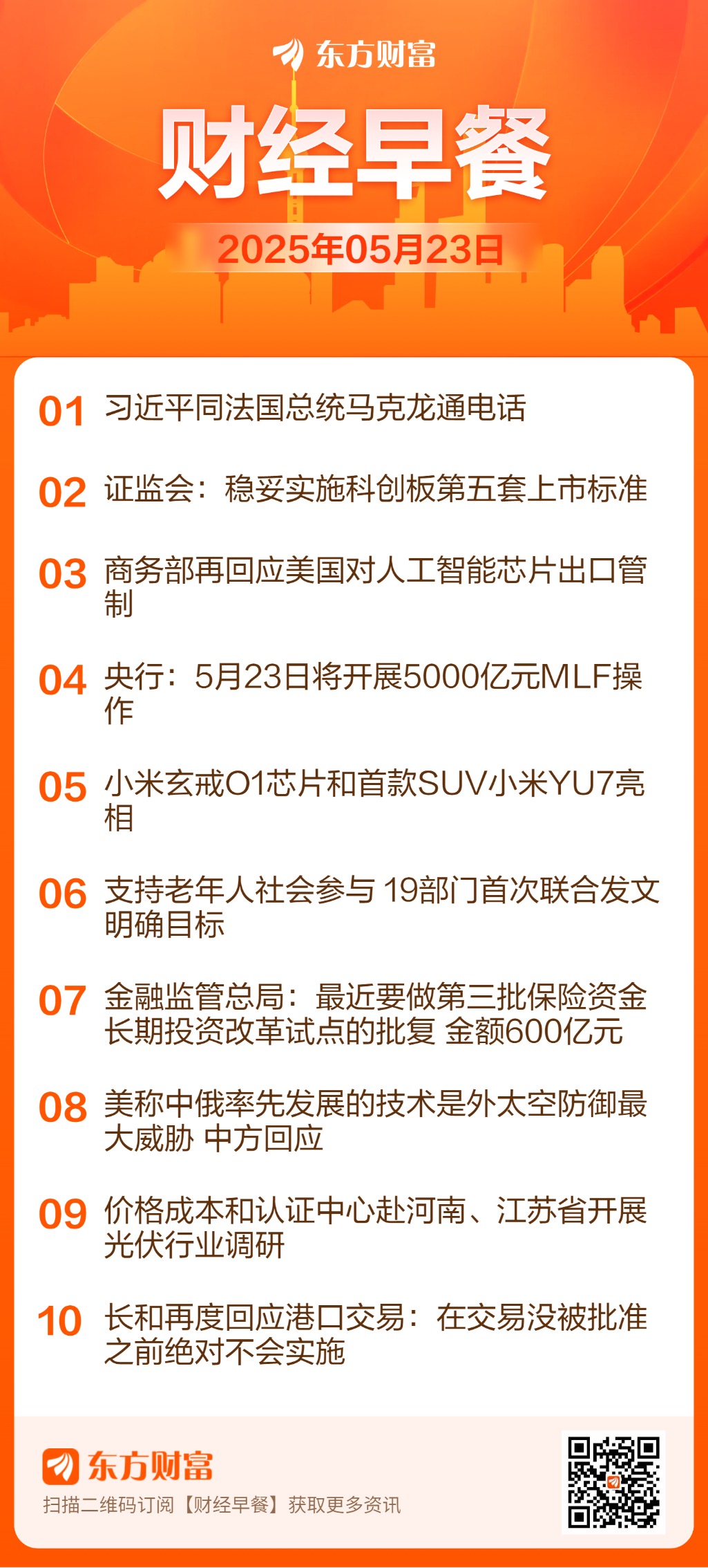 ![]() ![]() 1、新华网:5月22日下午,国家主席习近平应约同法国总统马克龙通电话。习近平指出,中方始终视欧洲为多极世界的独立一极,支持欧盟加强战略自主,在国际事务中发挥更重要作用,愿同欧方携手应对全球性挑战,达成更多既造福双方、也有利于世界的成果。马克龙表示,愿同中方加强经贸投资及各领域务实合作,保持双边关系良好发展势头,推动法中关系取得更大发展。 2、新华社:中国证监会发行监管司司长严伯进5月22日在国新办发布会上说,用好用足现有制度,更大力度支持优质未盈利科技企业上市,积极稳妥实施科创板第五套上市标准,推动新的典型案例落地。 3、央视新闻:商务部发言人就美国对人工智能芯片出口管制问题进行回应。发言人表示,中方已多次阐明立场,美方滥用出口管制,对中国进行遏制打压,违反国际法和国际关系基本准则,严重损害中国企业正当权益,危害中国发展利益。中方对此坚决反对,将密切关注美方后续情况,并采取坚决措施维护自身正当权益。 4、央行:为保持银行体系流动性充裕,2025年5月23日(周五),中国人民银行将以固定数量、利率招标、多重价位中标方式开展5000亿元MLF操作,期限为1年期。 5、界面新闻:5月22日,小米发布搭载自主研发设计的玄戒芯片的多款消费电子产品。小米表示,玄戒O1旗舰处理器采用第二代3nm先进工艺制程,190亿晶体管,芯片面积109mm²,实验室跑分突破300万。小米同时宣布,小米YU 7正式发布,定位 “豪华高性能SUV”。 新华社:近日,民政部等19部门首次联合印发《关于支持老年人社会参与推动实现老有所为的指导意见》。意见提出,到2035年,老年人社会参与服务体系更加健全,适合老年人的多样化、个性化就业岗位更加丰富,积极老龄观成为全社会共识,老年人力资源得到有效开发利用,老年人作用发挥更加充分。 财联社:科技部副部长在新闻发布会上表示,近期七部门发布的《加快构建科技金融体制有力支撑高水平科技自立自强的若干政策举措》是实现科技和金融双向奔赴的基础性、引领性制度安排,科技部将充分发挥牵头部门作用,进一步细化任务分工,明确任务实施的节点,推动政策举措的落地实施、尽早见效。 财联社:金融监管总局发言人郭武平在新闻发布会上表示,保险资金长期投资改革试点的首批试点规模是500亿元,第二批试点是1120亿元,最近还要做第三批600亿元的批复,规模合计是2220亿元。 人民财讯:人民银行副行长、国家外汇局局长朱鹤新5月22日在国新办新闻发布会上表示,债券市场“科技板”支持发行人灵活分期发行债券、简化信息披露要求、减免债券发行交易的部分手续费。债券市场“科技板”将重点支持排名靠前、投资经验丰富的头部股权投资机构发行债券。 中国新闻网:美国太空作战司令部司令萨尔茨曼近日表示,中国和俄罗斯军队率先发展的外空技术是美方外太空防御的最大威胁。对此,外交部发言人表示,中国始终坚持和平利用外空,反对外空军备竞赛,反对外空武器化。中国无意与任何国家搞太空竞赛,也不谋求所谓的“太空优势”。我们敦促美方停止散播不负责任的言论,停止在外空扩军备战,切实维护外空的持久和平与安全。 新华社:海关总署发布数据显示,截至目前,中东欧相关国家已有126种农食产品获得对华准入,累计注册3430家境外农产品企业。近年来,随着准入评估制度不断优化、通关效率大幅提高,波兰琥珀啤酒、拉脱维亚鱼罐头、塞尔维亚李子干等越来越多中东欧美味涌入中国市场,丰富消费者的选择。 每日经济新闻:代表全美81个港口的美国港务局协会(AAPA)表示,对中国制造的起重机征收进口关税可能会使美国损失近67亿美元,并抑制基础设施的投资升级。该协会首席执行官在美国首都华盛顿举行的听证会上,针对美国贸易代表办公室对中国制造的岸桥起重机征收100%关税的提案提出反对意见。他敦促美国贸易代表办公室豁免已下单采购的起重机关税。 中国网信网:中央网信办宣布启动为期2个月的“清朗·优化营商网络环境—整治涉企网络‘黑嘴’”专项行动。专项行动聚焦网络“黑嘴”伤企乱象,重点整治四类突出问题,分别是恶意抹黑诋毁攻击企业问题、对企业进行敲诈勒索问题、恶意营销炒作问题和泄密侵权类问题。 央视新闻:针对网民反映强烈的算法推荐加热低俗信息、加剧“信息茧房”、加重观点极化等问题风险,中央网信办督促指导重点平台针对性优化信息推荐算法功能、调整信息推荐算法规则。近日,抖音、小红书、微博、快手、微信视频号、哔哩哔哩等平台围绕正能量内容加权推荐、用户自主选择权保障、推荐内容多样性优化、提升算法透明度等核心环节,系统性优化完善多项功能。 财联社:价格成本和认证中心副主任成钢同志带队赴河南省郑州市、洛阳市、安阳市和江苏省常州市开展光伏行业调研。调研组实地考察了中建材(洛阳)新能源有限公司、阿特斯光伏电力(洛阳)有限公司、河南安彩高科股份有限公司、江苏赛拉弗光伏系统有限公司,并与河南省发展改革委、河南豫能新能源有限公司、英利能源发展有限公司等单位座谈交流,深入了解光伏产业发展以及企业经营情况等。中心新能源价格成本处有关同志参加调研。 财联社:比亚迪在欧洲销售的电动汽车数量首次超过特斯拉,超越了这个长期主导欧洲电动汽车市场的