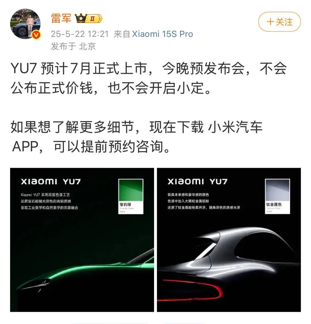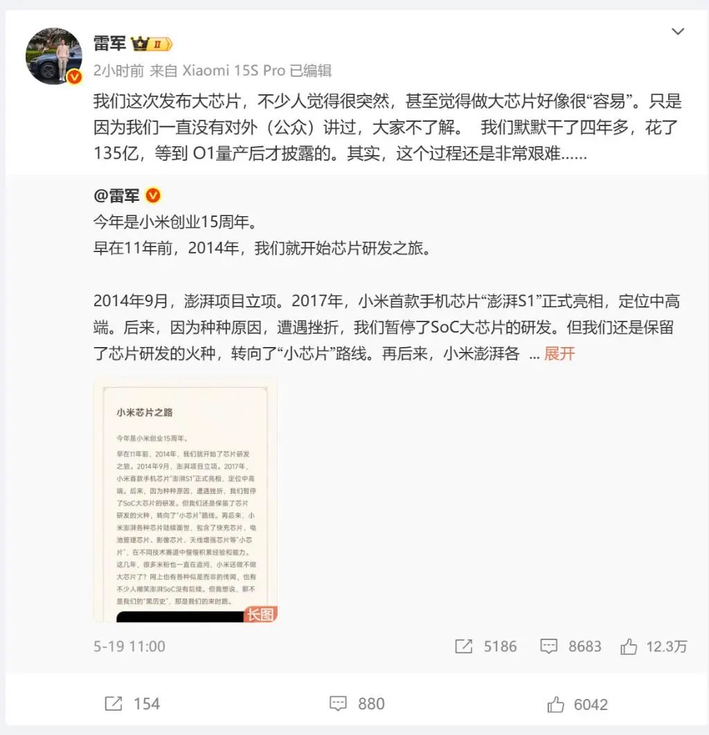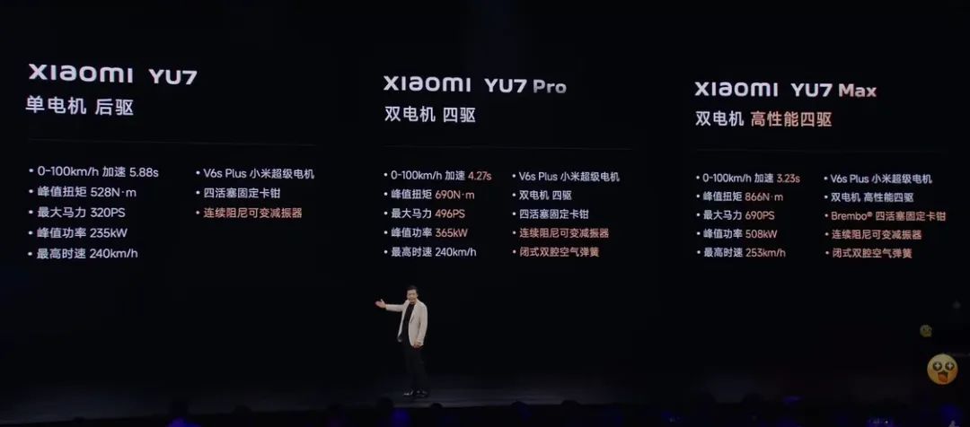 5月22日,小米15周年战略新品发布会举办。 发布会上,小米YU7车型正式亮相。雷军还发布了小米自主研发设计的首款3纳米旗舰处理器“玄戒O1”,该芯片将搭载在小米最新发布的旗舰手机和平板产品上。 小米YU7正式发布 在本次发布会上,最引人注目的便是小米汽车首款SUV车型——小米YU7。 据雷军介绍,小米YU7长宽高分别为4999/1996/1608(1600)mm,轴距达到3000mm,是一款中大型SUV。 ![]() 性能方面,标准版YU7(单电机后驱)搭载V6s Plus超级电机,峰值功率235kW;最大马力320PS,528N·m扭矩;匹配连续阻尼可变减振器与四活塞卡钳;极速锁定240km/h。 小米YU7共有三个版本——单电机后驱的小米YU7,双电机四驱的小米YU7 Pro和最高性能的小米YU7 Max,其中标准版搭载了96.3kWh磷酸铁锂电池,续航达835公里。 ![]() 雷军介绍,小米YU7全系标配激光雷达、4D毫米波雷达、700TOPS英伟达芯片等。 ![]() 谈到定价,雷军表示,有网友提到19万9,“这是不可能的,对标ModelY的配置,卖到30几万差不多。” 值得注意的是,5月22日中午,雷军发文称,YU7预计7月正式上市,今晚(22日)预发布会,不会公布正式价钱,也不会开启小定。 ![]() 据蓝鲸新闻报道,21日,记者发现在二手平台有大量小米YU7的代抢订单。卖家声称,小米YU7代抢战绩可查,成功率99%,全国首批提车等。代抢费用普遍在1000~5000元,价格最高的可达1.2万元。 ![]() 其中一位1500元代抢费的卖家称:“只要拍下明天发布会后就能登录你的账号代抢,因为新车交付肯定都会有一定余量的现车,这里抢的是第一批现车,现车只有几千台,名额有限。” 除了用“外挂”代抢外,市面上还有另一种抢现车的方式,也就是所谓的内部优先购车。 对此,小米销售回应称:“这种都是黄牛,任何以付钱形式代抢的黄牛都是骗人的。目前我们内部已经明文规定不接受黄牛代抢,代抢用户到时提车有很大风险会提不了,车辆下线后会直接留到下一位用户。而且代抢会有信息泄露的风险。” 事实上,早在去年3月,小米公关部总经理王化就曾辟谣过有关使用F码可以优先购买小米SU7的传言。当时王化表示,目前没有“F码”或类似优先购买的渠道。 据证券时报,国金证券研报认为,小米YU7有望打破Model Y在纯电SUV领域的统治地位。目前国内B级及以上纯电SUV赛道,Model Y一家独大,其余车型集中度分散。2024年国内市场B级及以上纯电SUV累计销量约166万辆,其中Model Y销量高达55.67万辆,断档领先。 上述研报表示,根据目前小米汽车获得订单的节奏,以及SU7 Ultra的火热,预计小米汽车在2025年销量可以逼近产能上限,意味着YU7有望成为Model Y之后新一款热销中高端纯电SUV车型。 小米发布“玄戒O1”芯片 雷军:小米的芯片要对标苹果 发布会上,小米集团董事长雷军还介绍了小米自主研发设计的首款3纳米旗舰处理器“玄戒O1”,该芯片将搭载在小米最新发布的旗舰手机和平板产品上。 “玄戒O1芯片的CPU为10核心,GPU为16核心,研发设计充分利用底层硬件特性,为用户提供更好使用体验。”雷军在发布会上介绍。 小米公司表示,小米15S Pro、小米平板7 Ultra、小米手表S4全部搭载小米自主研发设计的玄戒芯片。小米表示,玄戒O1旗舰处理器采用第二代3nm先进工艺制程,190亿晶体管,芯片面积109mm²,实验室跑分突破300万。 雷军还称:“开始研发的时候,我们定的目标确实有点高。首先,要做就做最高端体验的处理器;其次,要用全球最先进的工艺制程;第三,我们希望要做到第一梯队的水平,当时甚至想我们的高端手机对标苹果。实话实说,我们离苹果(的芯片)确实有差距,大家不要指望上来我们就能吊打、碾压苹果,苹果是全球的顶尖水平。一个月前,我开始试用小米15S Pro,刚开始我多少(有些)担心,用了一个月以后,我心里很踏实。” 搭载小米自研芯片玄戒O1的小米15S Pro从512GB版本起售,售价为5499元~5999元,同时享受国家补贴。 雷军表示:“五年前,小米十周年的时候,我们用半年时间思考了一个非常简单的问题,小米从哪里来,要到哪里去?针对这个问题的深入讨论,我们重新梳理了小米的战略,明确了新十年的奋斗目标,并坚定地执行。今天,到了十五周年,我们公布过去五年的成绩单:小米手机市场份额连续19个季度位居全球第三;其次,小米汽车、玄戒芯片智能工厂全部建成,完成从0到1的跨越;第三,人车家全生态的战略正式闭环。” 总结过去五年的经验,雷军认为,最重要的原因是坚持技术为本。“过去五年,小米曾宣布投入1000亿元,五年已经过去,我们大约投了1020亿元人民币。在接下来的五年,小米决定在核心技术的研发上再投入2000亿元。等(到)小米二十周年,肯定会交出更好的答卷。” ![]() 图片来源:小米发布会直播 此前,雷军发布微博透露,研发玄戒O1芯片的过程“还是非常艰难”。四年多时间,截至今年4月底,玄戒累计研发投入已超过135亿人民币。目前,研发团队已超过2500人,今年预计研发投入将超过60亿元。 ![]() (文章来源:红星资本局) |