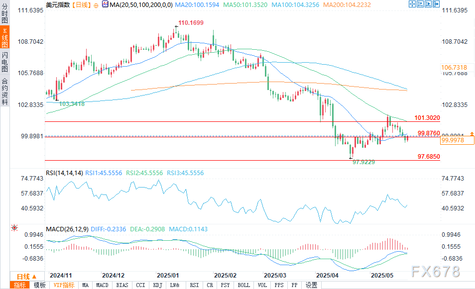 周四 5月22日 美盘时段 美元指数略高于99 949这一关键短期枢轴点 较两周低点99 333略有回升 尽管价格走势看似趋稳 但交易员仍持谨慎态度 收益率上升带来的美元支撑 如今正与日益明显的资本外流和债券市场压力相抗衡 ...