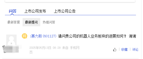5月23日,新能源汽车明星股赛力斯(601127.SH)盘中多次涨停,最高报145.87元/股,逼近历史新高,总市值接近2400亿元。 南财快讯记者注意到,今日有市场消息称,“赛力斯人形机器人原型已定型,赛力斯定于6月16日(周一)展示人形机器人Demo。” 对此,记者以投资者身份致电赛力斯求证,工作人员表示,公司的业务信息以官方发布的信息为准,目前公司没有发布上述的信息。 该人员进一步透露,作为新能源汽车企业,首先会聚焦于主业,去做好智能电动汽车。其次,对于其他行业(机器人领域)的前沿技术动态,也会持续关注和探索。 ![]() 据赛力斯4月发布的公告披露,赛力斯智慧工厂拥有机器人超5000台。值得一提的是,曾有多位投资者在互动平台向赛力斯提问机器人业务,但该公司并未透露相关信息。 ![]() (文章来源:21财经) |