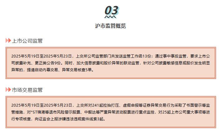 据上交所消息,2025年5月19日至2025年5月23日,上交所公司监管部门共发送监管工作函13份;通过事中事后监管,要求上市公司披露补充、更正类公告9份。同时,加大信息披露和股价异常的联动监管,针对公司披露敏感 ...