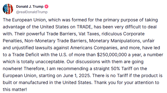5月23日,美国总统特朗普在其社交媒体上表示,他建议从6月1日起对欧盟商品征收50%的关税。特朗普称,“欧盟成立的主要目的就是在贸易上占美国的便宜,一直都很难打交道。我们和他们的磋商毫无进展!” 相关报 ...