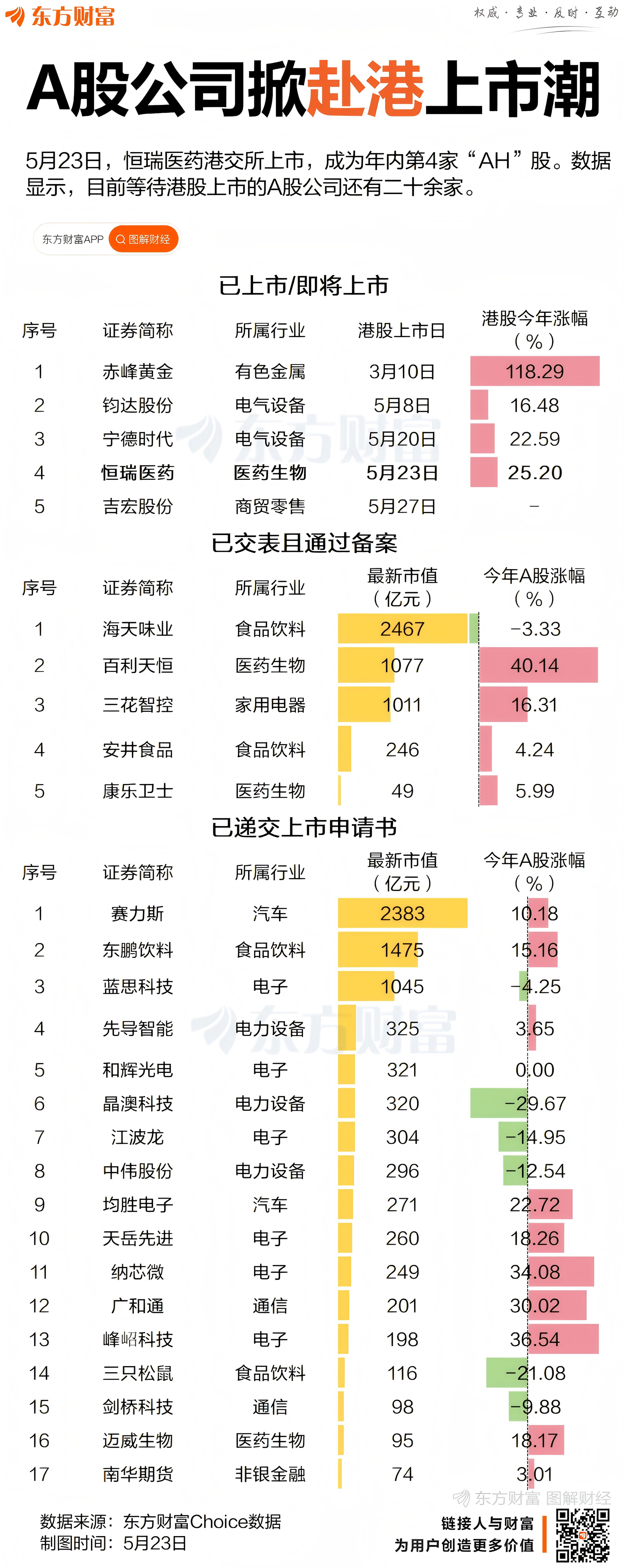 ![]() A股上市公司,正在掀起一波赴港的上市高潮。继宁德时代之后,5月23日(周五),医药巨头恒瑞医药正式登陆港交所,成为年内第4只“AH”股。上市首日,恒瑞医药港股暴涨25.20%,最新总市值达3642亿港元。5月27日(周一),吉宏股份将登陆港交所,成为年内第5只“AH”股。 恒瑞医药能有如此表现的原因或与以下三点有关:一是公司本身质量颇佳;二是2025年以来港股上演了一场“创新药牛市”,港股创新药指数今年涨超30%;三是港股IPO赚钱效应持续凸显,赤峰黄金、钧达股份、宁德时代等上市后股价均有优异表现。 据不完全统计,除了上述已上市/即将上市的公司外,当前还有二十余家A股公司已向港交所递交招股书,其中获得中国证监会备案的目前有5家,分别为海天味业、百利天恒、三花智控、安井食品、康乐卫士。值得一提的是,康乐卫士为北交所股票,或将成为“北+H”第一股。 业内人士认为,越来越多企业通过港股这个平台,链接国际资金,接轨全球估值体系,真正实现了“好公司不仅要被看见,更要被公平定价”,这背后是资本市场从局部走向全球的趋势。相比2019年到2021年中概股回归,这一轮港股上市潮更具主动性,类似宁德时代等具有行业全球影响力的公司,主动选择香港这一国际金融枢纽来拓展第二增长曲线,这不仅体现了企业全球化的战略定力,也说明港股正逐步成为中国资产价值发现的核心平台。 (文章来源:东方财富研究中心) |