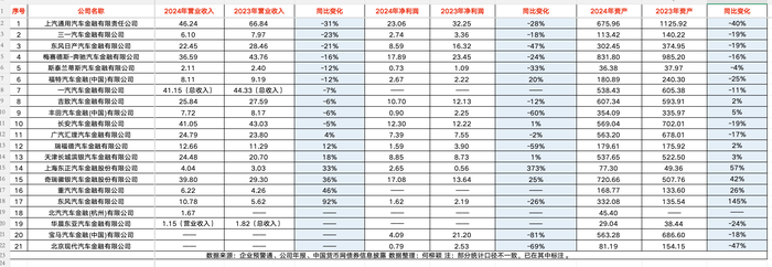汽车金融公司发展整体承压。 在25家持牌汽车金融机构中,剔除掉部分财务数据未有披露、已进入破产程序(华泰汽车金融)、数据未经审计(比亚迪汽车金融)的4家公司,界面新闻记者梳理了21家汽车金融公司的2024年经营数据。 可比数据显示,过半公司营收下滑,其中上汽通用汽车金融等5家公司营收、净利、资产规模均出现缩减,从企业类型看,多为合资和外资公司。 营收表现较好的是奇瑞徽银汽车金融,三项主要数据均有两位数的同比增长;以及基数较低的上海东正汽车金融,该公司于2024年实现了2.65亿的净利润,同比大增373%。 资产规模缩减700亿元 整体而言,汽金公司资产规模出现收缩。 ![]() 汽金公司2024年经营数据 可比数据显示,20家汽金公司2024年总资产为7463亿元,较2023年的8224亿元下降了761亿元。 总资产缩减最明显的是北京现代汽车金融,该公司2024年资产为81亿元,较2023年的154亿元接近砍半。 上汽通用汽车金融作为曾经的“王者”,2024年资产缩减至676亿元,同比降幅达到40%。2024年末,梅赛德斯-奔驰汽车金融、奇瑞徽银汽车金融的资产规模均已超过了上汽通用汽车金融。 资产降幅较大的还有福特汽车金融(中国),2024年资产为181亿元,较2023年下降了25%。 具体来看,以上三家公司的资产缩减主要源于贷款规模减少。2024年上汽通用汽车金融发放贷款金额为488亿元,较2023年同比大幅减少441亿元。北京现代汽车金融、福特汽车金融2024年发放的贷款分别为56亿元、165亿元,分别较2023年同比减少了44亿元、54亿元。 此外,华晨东亚汽车金融、东风日产汽车金融、三一汽车金融、长安汽车金融的2024年资产均出现了20%左右的同比下滑。 作为对比,东风汽车金融、上海东正汽车金融、奇瑞徽银汽车金融实现了较显著的资产增长。其中东风汽车金融从2023年的136亿元扩张至2024年的332亿元,同比涨幅高达145%。 与上述资产缩减逻辑一致,规模调整主要有赖放贷业务的增长。包括东风汽车金融2024年发放贷款192亿元,较2023年增长94亿元。奇瑞徽银汽车金融2024年发放贷款529亿元,同比增长86亿元。 过半营收下滑 17家汽金公司的可比数据显示,过半(10家)公司营收出现同比下滑。 从收入规模看,上汽通用汽车金融居首,2024年营业收入达到46.24亿元,但同比降幅同样居于首位,营收较2023年同比下降了31%。数据显示,主要是利息净收入下滑,2024年为43.01亿元,较2023年减少了约12亿元;其他收入也较2023年减少了8亿元。 此外,三一汽车金融、东风日产汽车金融的营收下滑也比较明显,同比降幅均超过20%。 净利润下降幅度更为明显。2024年,宝马汽车金融(中国)净利润4亿元,较2023年净利润21亿元下降了81%。数据显示,宝马汽车金融(中国)2024年利息净收入为28.36亿元,较2023年同比减少了10亿元;营业利润为7.32亿元,较2023年同比减少了21亿元。 北京现代汽车金融、丰田汽车金融(中国)、瑞福德汽车金融的净利润降幅均在60%左右。 值得注意的是,瑞福德汽车金融在2024年实现了12%的营收增长,增收却未能增利。数据显示,该公司2024年营业支出达到10.37亿元,而2023年为6.46亿元,其中主要是业务及管理费、信用减值损失增加所致。 信息显示,该公司贷款逾期情况出现恶化。在2023年,逾期1年至3年的抵押贷款为10万元,在2024年,此类逾期贷款总额达到32万元;逾期1天至60天的抵押贷款从2023年的4亿元增长至5亿元;逾期61天至369天的抵押贷款有所减少。 经营表现较好的有重汽汽车金融、奇瑞徽银汽车金融以及上海东正汽车金融,三家公司分别在2024年实现了46%、36%、33%的营收增幅。 其中上海东正汽车金融在2024年实现了2.65亿元的净利润,较2023年同比大增373%。数据显示,该公司2024年利息净收入有1.4亿元的增长,与此同时营业支出也较2023年有所减少。 值得注意的是,同为上汽集团的下属公司,通用汽车金融与东正汽车金融表现分化。从规模上看,通用汽车金融作为我国第一家持牌汽金公司,经营实力依然瞩目,无论是注册资本、资产规模、经营规模,都明显强于东正汽车金融,但2024年经营增速不敌东正汽车金融。 ![]() 图源:上汽集团2024年年报 一方面,上海东正汽车金融整体规模不大,低基数的情况下有利于实现较快的盈利增速。另一方面,在“易主”后,得益于上汽的资源支持,业务增长势能也优于从前。 上海东正汽车金融成立于2015年,由正通汽车及东风汽车共同出资设立,2022年,上汽集团收购了该公司71.04%的股份,其后持股比例进一步扩大。在2024年10月29日,上海东正汽车金融完成了首批上汽大通经销商库存及零售融资业务上线,这对公司的贷款业务起到提振作用,2024年发放贷款和垫款64亿元,较2023年同比增加了20亿元。 扩张承压 从营收、净利、资产规模三个指标看,2024年均实现同比增长的有三家汽金公司,分别是奇瑞徽银汽车金融、上海东正汽车金融以及天津长城滨银汽车金融,其中奇瑞徽银汽车金融三项指标均实现了两位数的增长,表现亮眼。 奇瑞徽银汽车金融成立于2009年,是我国首家自主品牌汽车厂商与本土银行合资成立的汽车金融公司。该公司的经营增长一方面得益于厂商汽车销售的业务增长,在2024年,奇瑞集团全年销售汽车达到历史性的260万辆,同比增长38.4%,创造了年销量的历史新高。 从行业看,这一成绩也相当瞩目,在2024年,我国汽车销量同比增长4.5%。 另一方面,也得益于该公司的联合贷款模式,在2018年5月,该