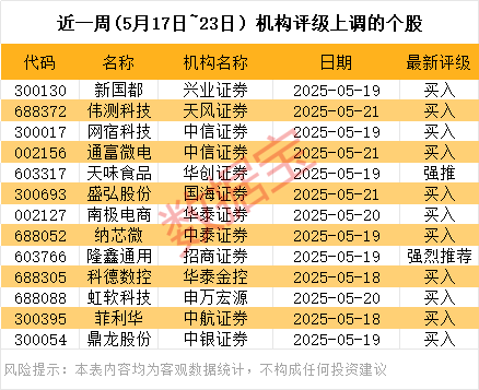 多只半导体个股获机构上调评级。 据证券时报·数据宝统计,近一周(5月17日~23日),合计有53家机构进行了501次评级,共计424股被券商研报给予“买入型”评级(包括买入、增持、强烈推荐、推荐)。 电子、 ...