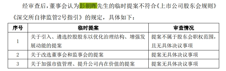 5月22日,银禧科技(300221)晚间披露,公司董事会收到持有股东彭朝晖提交的临时提案。彭朝晖提议公司2024年年度股东大会增加三项提案。他在提案中建议上市公司全球“招聘”控股股东,改选董监会以及加强市值管理等。 ![]() 其中最引人瞩目的就是第一项提案,内容为:引入、遴选控股股东以优化治理结构、增强发展动能。 具体来看,他表示,鉴于银禧科技长期无实际控制人在资源整合、战略落地、资本运作等方面存在掣肘,建议董事会启动全球范围内公开引入和遴选具备新质生产力背景的控股股东。通过并购重组方式引入具有战略契合度和产业协同性的战略投资方,完善公司治理结构,增强持续发展能力。 彭朝晖建议公司控股股东应具备以下两个条件:一是主营业务收入不低于10亿元,净利润不低于2亿元,或具备20亿元以上的产业赋能资金能力;二是,股东在战略方向需高度契合公司“AI+、低空经济、机器人、新材料、6G”等新经济领域,具备强大的科技创新能力和上下游资源整合能力。 同时他还建议,控股方式可通过二级市场增持、向特定对象定向增发,或通过取得董事会控制权实现对上市公司的实际控制。 该提案最终被董事会认为不属于股东会职权范围,且无具体决议事项。公司表示,彭朝晖的三个临时提案不符合《深交所自律监管2号指引》、《上市公司股东会规则》和《公司章程》的规定,董事会将不予提交股东大会审议。 除了第一条外,彭朝晖还提出了改选董事会和监事会,建议银禧科技启动董事会换届,通过公开征集及前十大股东联合提名方式,引入1名具备AI+、新材料、新经济领域产业背景的非独立董事及1名独立董事;监事会方面则引入1名具备低空经济或机器人产业背景的中小股东代表或机构投资者担任外部监事。 此外,他还建议上市公司设立由董事长直接负责的市值管理部门,推动并购重组,强化投资者关系管理,稳定与提升股价等。 以上提案均被董事会认为不符合《上市公司股东会规则》 《深交所自律监管2号指引》的规定,提案无具体决议事项。 2021年7月,银禧科技前实控人谭颂斌控制公司股份仅剩下1891.79万股,占公司当时总股本的4.20%。因为股票质押平仓等因素,谭颂斌通过瑞晨投资持有的银禧科技股权连续遭遇被动减持。银禧科技彼时公告称,公司已不存在任一股东可以单独依其可实际支配的股份表决权对公司股东大会决议产生重大影响等情形,公司无控股股东、实际控制人。 彭朝晖系A股知名牛散,其在今年第一季度成为银禧科技第一大股东。同时,彭朝晖的名字还在今年出现在了日联科技、英诺特、恒锋工具以及银禧科技等公司前十大流通股东名单。 (文章来源:深圳商报) |