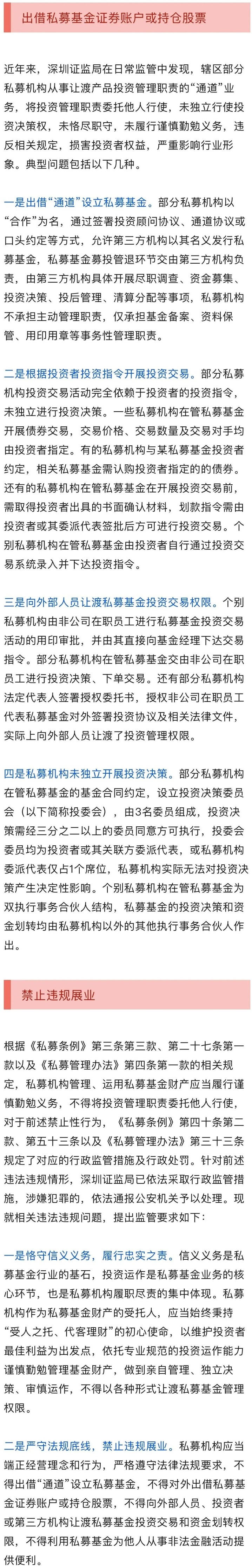 5月23日,深圳证监局发布了《深圳私募基金监管情况通报(2025年第3期)》,就私募检查发现的问题及监管要求进行了通报。 通报指出,有的私募出借私募基金证券账户或持仓股票。个别私募机构从业人员向外部人员 ...