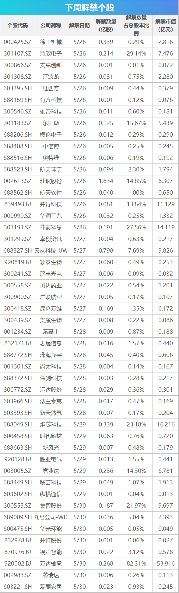 【重磅新闻】 MSCI中国指数调整将生效 日前,明晟公司(MSCI)公布了5月份指数审议结果。在本次调整中,MSCI中国指数新纳入芯原股份、百利天恒、惠泰医疗、光线传媒、海思科5只A股,和港股重庆农村商业银行,共计6只中国股票;剔除海信家电、一汽解放、上海医药、金诚信等17只股票。 除MSCI中国指数以外,MSCI中国A股在岸指数的成分股名单也有所调整,增加成分股8只,包括翱捷科技-U、中国卫通、海思科、杭钢股份、艾力斯、百利天恒、拓维信息、芯原股份。调整结果将于5月30日收盘后生效。 5月PMI数据将公布 5月31日,国家统计局将公布5月PMI数据。据国家统计局,4月份,制造业采购经理指数为49.0%,比上月下降1.5个百分点;非制造业商务活动指数和综合PMI产出指数分别为50.4%和50.2%,继续保持在扩张区间。 国家统计局服务业调查中心高级统计师赵庆河指出,总体看,综合PMI产出指数自2023年1月以来始终位于临界点以上,我国经济总体产出持续扩张,长期向好的基本面没有改变。受外部环境急剧变化等因素影响,4月份制造业采购经理指数有所回落,但高技术制造业等相关行业继续保持扩张,以内销为主的制造业企业生产经营总体稳定。 中国-上海合作组织人工智能合作论坛将举办 中国-上海合作组织人工智能合作论坛将于5月29日在天津举办。本次论坛主题为“智汇中国智惠上合”,其间拟组织发布相关工作成果,并邀请中外专家围绕“人工智能技术突破与路线探索”“应用案例分享及前景展望”“安全风险和监管治理”等议题开展系列交流活动。 中国将对巴西等5国实行免签政策 自2025年6月1日起至2026年5月31日,中国对巴西、阿根廷、智利、秘鲁、乌拉圭持普通护照人员试行免签政策。上述5国持普通护照人员来华经商、旅游观光、探亲访友、交流访问、过境不超过30天,可免办签证入境。 华为将举行尊界S800发布会 华为终端近日宣布,将于5月30日19:30举行尊界S800发布会。 下周近168亿元市值限售股解禁 Wind数据统计显示,下周(5月26日-5月30日)共有48家公司限售股陆续解禁,合计解禁5.28亿股,按5月23日收盘价计算,解禁总市值为167.99亿元。 从解禁市值来看,按最新收盘价计算,解禁市值居前三位的是:万达轴承(53.92亿元)、炬芯科技(16.22亿元)、菲菱科思(14.12亿元)。从个股的解禁量看,解禁股数居前三位的是:北玻股份(1.63亿股)、云从科技-UW(0.8亿股)、徐工机械(0.34亿股)。 ![]() 【新股机会】 下周将有3只新股发行 Wind数据显示,下周将有3只新股发行。具体来看,5月26日发行的是优优绿能;5月27日发行的是交大铁发;5月30日发行的是影石创新。 ![]() (文章来源:第一财经) |