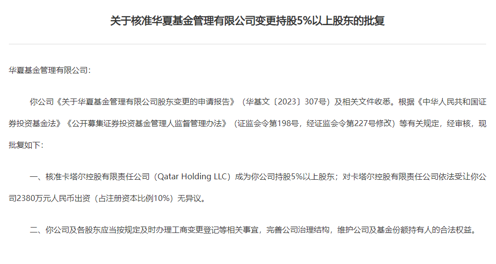 华夏基金10%股权转让事宜,正在稳步推进。 日前,中国证监会信息显示,核准卡塔尔控股有限责任公司(下称“卡塔尔控股”)成为华夏基金持股5%以上股东,对卡塔尔控股依法受让华夏基金2380万元人民币出资(占 ...