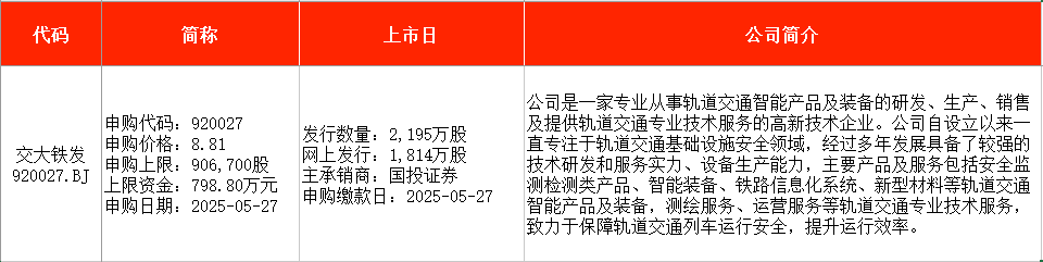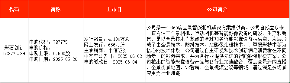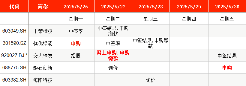 本周新股申购迎来“充电模块第一股”、全球智能影像设备行业领军企业,以及国铁集团、中国铁建、中国中铁等的供应商。 澎湃新闻根据Wind及公开信息梳理统计,本周(5月26日至5月30日),有3只新股安排申购。 ...