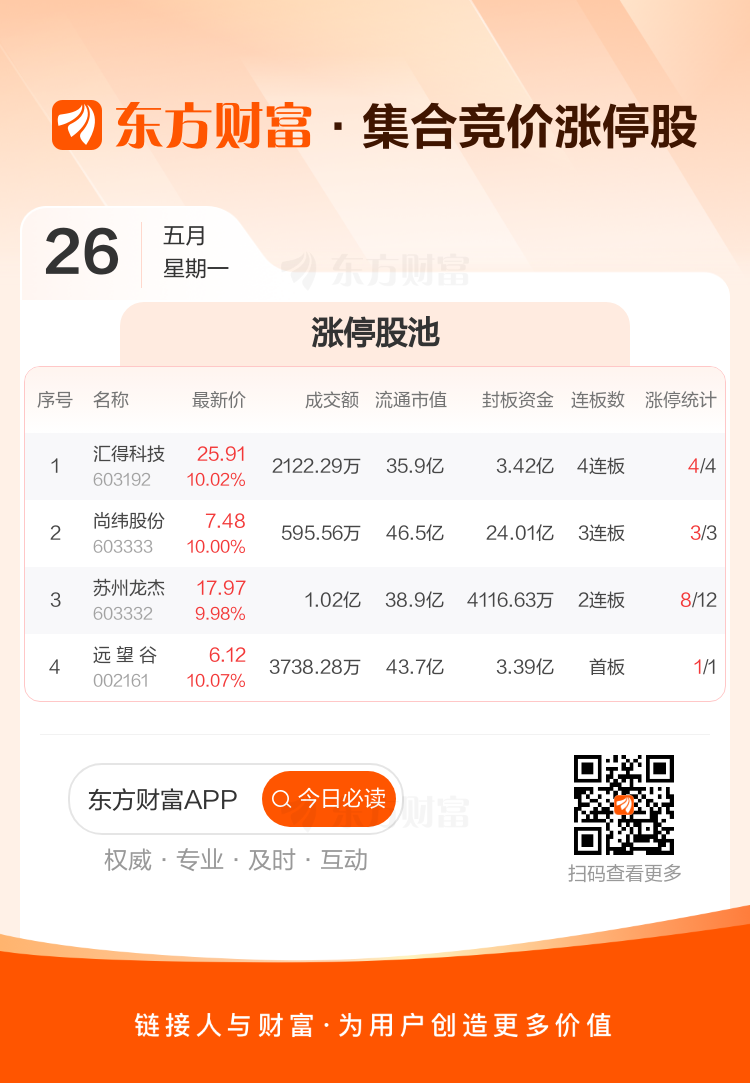 5月26日,三大指数集体低开,上证指数低开0.05%,深证成指低开0.17%,创业板指低开0.25%。板块方面,环保行业领涨,森远股份涨13.71%,化纤行业、电源设备等开盘涨幅居前。 ![]() 个股方面,4股竞价涨停,其中汇得科技4连板、尚纬股份3连板、苏州龙杰2连板、远望谷首板。 ![]() 免责声明:本文基于AI生产,仅供参考,不构成任何投资建议,据此操作风险自担。 (文章来源:东方财富研究中心) |