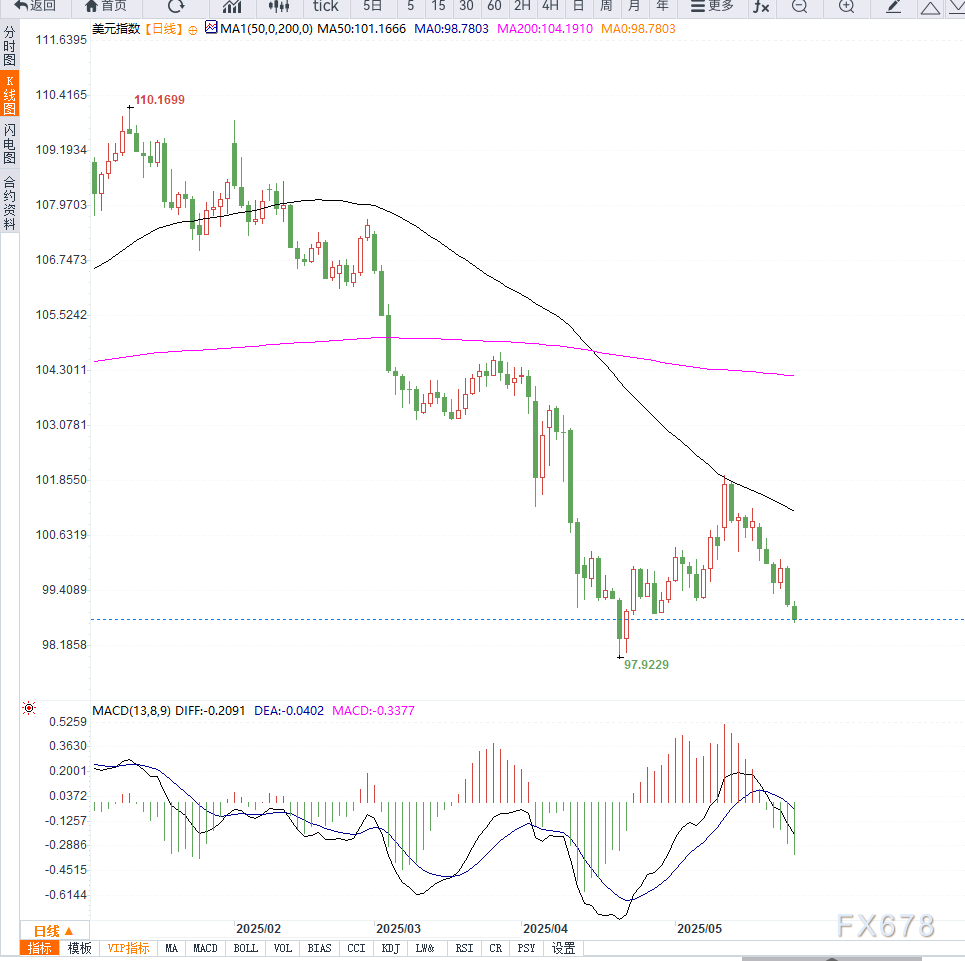 美元指数周一延续上周以来的跌势,在亚洲交易时段刷新一个月低点98.70,逼近4月下旬创下的多年低位97.95。此轮下跌主要归因于美国总统特朗普意外宣布暂停对欧盟征收50%高关税,极大缓解了市场对全球贸易局势进一步恶化的担忧情绪。 ![]() 周一跌幅达到0.3%,较5月初高点已累计回落近3%。美元在节假日期间交投清淡,但整体弱势格局明显。技术面上,若跌破98.50关键支撑,美元指数恐进一步测试97.95的年内低点。 展望本周,市场焦点将转向两大重磅事件: 其一是周三公布的美联储会议纪要,市场希望从中获取有关利率路径的新线索;其二是周五公布的核心PCE物价指数,作为美联储偏好的通胀指标,若数据疲软,可能加剧对美元的抛压。 从日线图形来看,美元指数(DXY)持续运行于下行通道中,技术面呈现空头排列格局。当前价格已跌破100日与200日均线,MACD动能柱持续位于零轴下方,显示下行动能尚未减弱。 相对强弱指标(RSI)处于38附近,尚未进入超卖区,但趋势偏弱。若后续无法守住98.50一线支撑,美元指数恐将进一步下探97.95的年内低位, 反之若短线反弹,上方初步阻力位关注99.40区域,进一步为心理关口100点。整体来看,技术面与基本面形成共振,美元中期承压格局难以扭转。 ![]() 特朗普关税政策的变动已成为影响美元走势的重要变量。虽然暂时推迟关税计划缓解了市场紧张情绪,但这种策略不确定性依旧对投资者构成干扰。 美元指数当前已连续数周下行,若缺乏强劲数据支撑,短期内可能难以逆转跌势。此外,若PCE物价指数表现不及预期,美联储维持观望的概率上升,美元将持续面临多重压力。在此背景下,需密切关注美联储政策走向与特朗普政策的最新进展。 ![]() |