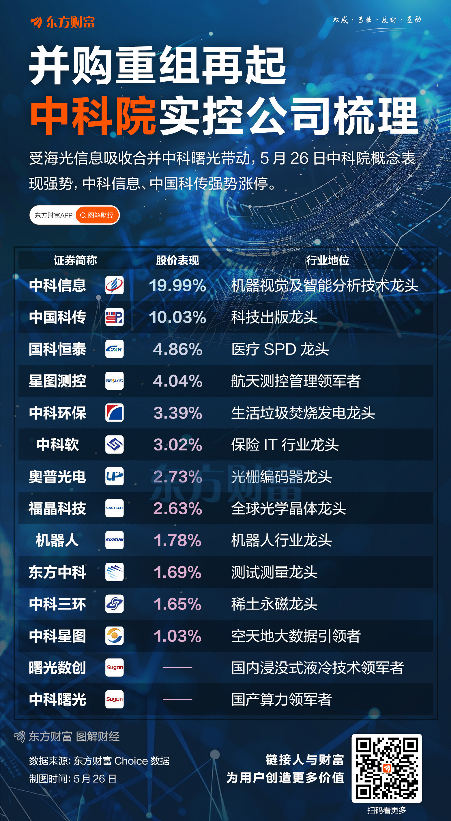 5月26日,中科院系概念走强,中科信息、中国科传双双涨停;国科恒泰、星图测控、中科环保等也明显上涨。 消息面上,5月25日晚间,沪市主板上市公司中科曙光与科创板上市公司海光信息双双发布公告称,两家公司 ...