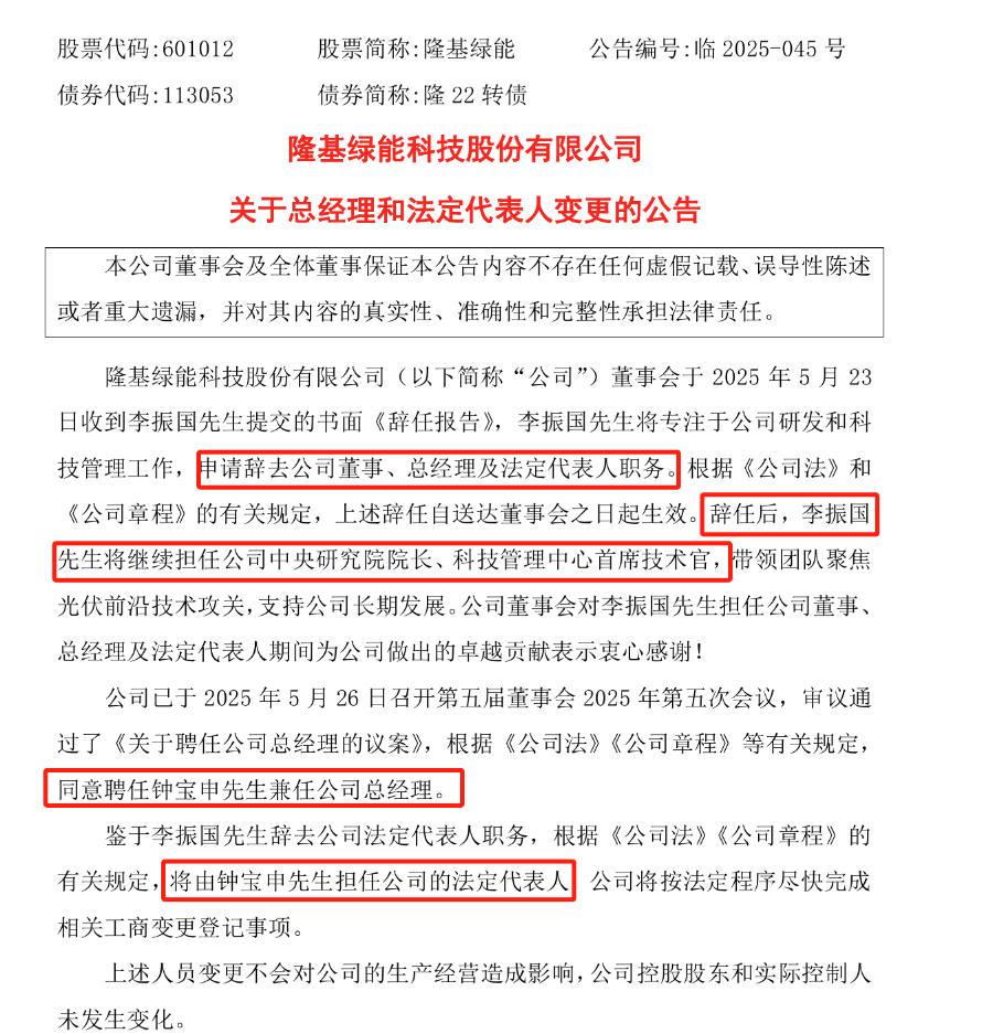 5月26日,千亿光伏巨头隆基绿能(601012.SH)公布了一项重大人事变动调整,事关该公司实际控制人李振国。隆基绿能发布人事调整公告图片来源:公告 公告显示,隆基绿能董事会于2025年5月23日收到李振国提交的 ...