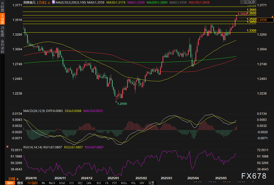 周一(5月26日),英镑兑美元延续近期强势表现,亚欧时段一度逼近1.3600整数关口,刷新三年高位,随后小幅回落至1.3556附近,日内涨幅0.16%。美元指数则延续疲软走势,跌至98.70附近,创一个月新低。英镑的强势表现主要受到美元走弱和英国经济数据向好的双重支撑,但技术面超买信号值得警惕。 ![]() 英镑本周初的强势表现,核心驱动力来自美元全面走弱和英国经济数据的持续向好。上周五,特朗普宣布对欧盟商品加征50%关税的决定一度引发市场避险情绪升温,但周日其又宣布将关税生效日期从6月1日推迟至7月9日,市场风险偏好随之改善。这一变化使得美元进一步承压,而英镑等非美货币则获得提振。 不过,英镑的强势并非仅靠美元走弱推动。近期公布的英国经济数据表现亮眼,4月CPI同比上涨3.5%,高于前值的2.6%;服务业通胀更是加速至5.4%,远超市场预期。同时,4月零售销售月率增长1.2%,大幅好于预期的0.2%。这些数据表明英国经济仍具韧性,市场对英国央行降息的预期随之降温。根据利率期货市场定价,交易员目前预计英国央行年内仅会降息一次,幅度为25个基点。 值得注意的是,特朗普近期对苹果等科技公司发出的关税言论也加剧了市场对美元资产的担忧。其威胁对未在美国本土生产的智能手机加征25%关税,这一政策不确定性进一步削弱了美元的吸引力。明尼阿波利斯联储主席卡什卡里警告称,新的关税政策可能带来滞胀风险,这令美联储的政策前景更加复杂。 技术分析:三年高位遇阻,短期或有回调压力 从技术面看,英镑兑美元近期走势呈现单边上涨特征,但超买信号开始显现。 日线级别:汇价已突破所有主要均线(50日/100日/200日均线),且均线呈多头排列,显示中长期趋势仍偏多。但RSI指标已升至67上方,接近超买区域,暗示短期回调风险。 4小时图:汇价在1.3600整数关口遇阻后小幅回落,短期支撑关注1.3500心理关口,若跌破可能进一步下探1.3450(前高转化支撑)。上行方面,若能突破1.3600,则下一目标看向1.3660和1.3750(2022年1月高点)。 关键点位: 上行阻力:1.3600(心理关口)、1.3660(技术阻力)、1.3750(长期阻力) 下行支撑:1.3500(心理支撑)、1.3450(前高转化支撑)、1.3330(21日均线) 机构分析师对后市看法存在分歧。OCBC外汇分析师指出,英镑的强势表现得益于英国经济数据超预期和美英贸易协定的达成,技术面动能依然强劲,上看1.3660和1.3750。但UOB集团分析师则认为,尽管中长期趋势仍偏多,但短期超买信号明显,1.3600关口可能难以有效突破。 ![]() 短期内,英镑走势将受以下因素影响: 美元动态:若美联储政策预期进一步转向鸽派,美元可能延续跌势,支撑英镑。但若美国经济数据表现强劲,或特朗普关税言论缓和,美元可能迎来反弹。 英国经济数据:本周将公布英国5月PMI数据,若继续表现强劲,可能进一步推升英镑。 技术面修正需求:在连续上涨后,英镑短期超买信号明显,需警惕回调风险。 综合来看,英镑中长期趋势仍偏多,但短期在1.3600关口附近可能面临阻力。交易者需密切关注本周经济数据及政策动向,以判断汇价能否延续涨势。技术面来看,1.3450-1.3500区域将成为短期重要支撑,守住该区域则后市仍有上行空间。 ![]() |
