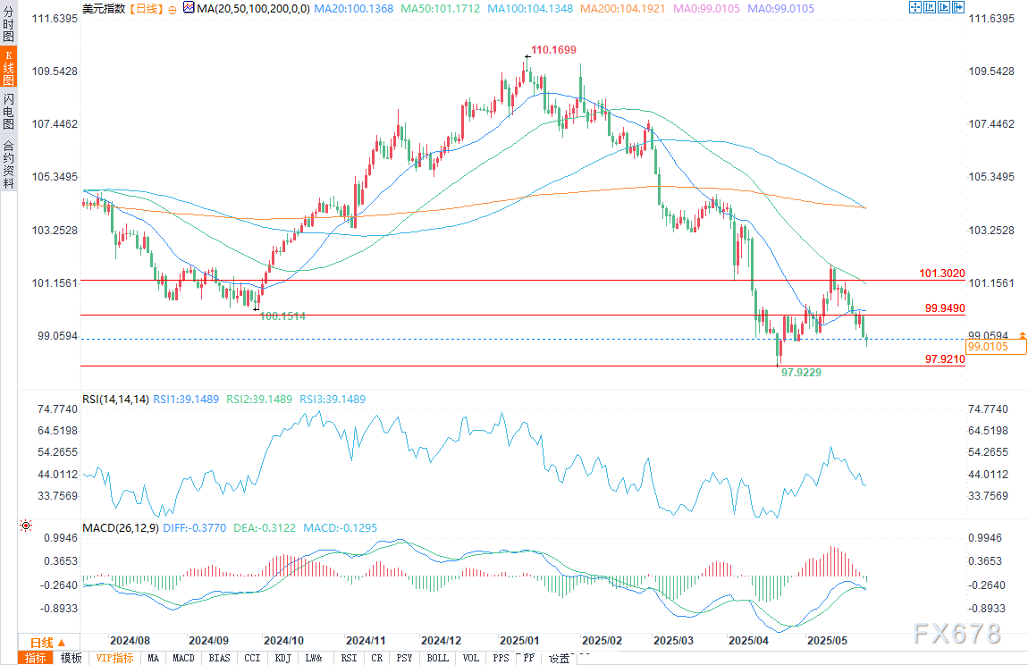 周一 5月26日 美盘时段 美元指数跌破5月6日99 172的支撑位 加剧了看跌情绪 这表明除技术形态外 市场存在更深层次的结构性担忧 交易员目前关注97 921一线 除非空头回补推动指数反弹至阻力位99 949上方 否则市场动能倾 ...