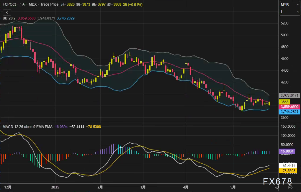 本周二 5月27日 尽管市场普遍预期马来西亚棕榈油产量及库存将延续增长态势 但BMD棕榈油主力合约FCPOc3仍逆势收高 截至收盘 8月合约报3868林吉特 吨 单日涨幅0 91 实现三连阳 技术面显示 布林通道中轨位于3859林吉 ...