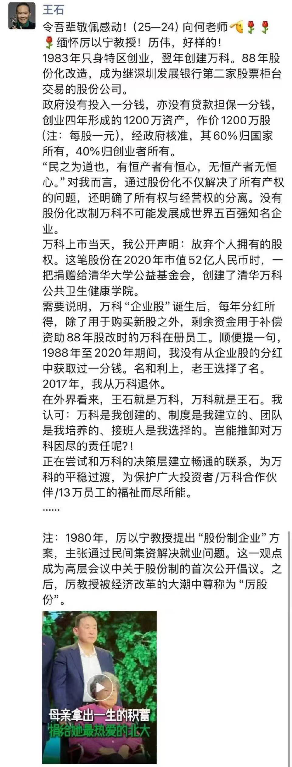 “在外界看来,王石就是万科,万科就是王石。我认可:万科是我创建的、制度是我建立的、团队是我培养的、接班人是我选择的。岂能推卸对万科应尽的责任呢?!”5月27日,万科集团创始人、名誉主席王石在朋友圈的一席发言引发了广泛关注。 ![]() 王石早在2017年6月时就已退任万科董事会主席一职。彼时66岁的王石通过微信朋友圈表示,“今天,万科公告了新一届董事会成员候选名单。我在酝酿董事会换届时,已决定不再作为万科董事被提名。”并将接力棒交给郁亮。 与此同时,万科董事会审议通过相关议案,为充分肯定王石过去33年对公司做出的不可替代的贡献,董事会委任王石为董事会名誉主席;王石作为名誉主席,不是公司的董事、监事或高级管理人员,不参与公司治理。 根据万科《2018年度社会责任报告》披露,王石的工作主要是为教育扶贫出力、出席气候大会、宣传垃圾分类等。 尽管已不参与公司经营或治理,但王石此时仍从万科领取高额“退休金”。2019年,据王石披露,他的“退休金”超过1000万,秒杀A股99%上市公司现任董事长及高级管理人员。 随着楼市下行,房地产行业持续调整,身为优等生的万科也难以避免地出现流动性压力,并开始聚焦化债举措。 此时,王石选择放弃了这笔“退休金”。2024年4月,时任万科总裁祝九胜在2023年度股东大会上对外披露,在现金流紧张的背景下,王石2023年自动放弃千万退休金,与公司共渡艰难时刻。 不过,在当前的行业形势下,万科也未能短时间内扭转困境,2024年归母净利润更是亏损超490亿元,这也是万科自1991年在A股上市以来首次年度亏损。万科在今年1月份的董事会决议公告也坦言,因2024年度业绩预告亏损额较大,集团流动性遇到阶段性困难。 这期间,万科还经历了一场核心高管的大换血,郁亮辞去公司董事会主席职务,将继续担任公司董事,并担任执行副总裁职务;祝九胜申请辞去公司董事、董事会投资与决策委员会委员、总裁、首席执行官、授权代表等职务,并不再担任公司任何职务。 与此同时,万科大股东深圳地铁集团派驻多位高管进入管理层,深圳地铁集团董事长辛杰接替郁亮,出任万科董事会主席。 或许也是因为万科管理层已发生一番大变化,王石在27日的朋友圈中表示,“正在尝试和万科的决策层建立畅通的联系,为万科的平稳过渡,为保护广大投资者/万科合作伙伴/13万员工的福祉而尽所能。” 王石同时表示,在万科“企业股”诞生后,每年分红所得,除了用于购买新股之外,剩余资金用于补偿资助1988年股改时的万科在册员工。“顺便提一句,1988年至2020年期间,我没有从企业股的分红中获取过一分钱。名和利上,老王选择了名。” 王石还在朋友圈中回顾其创业历程称,“1983年只身特区创业,一年创建万科。88年股份化改造,成为继深圳发展银行第二家股票柜台交易的股份公司。政府没有投入一分钱,亦没有贷款担保一分钱,创业四年形成的1200万资产,作价1200万股(注:每股一元),经政府核准,其60%归国家所有,40%归创业者所有。” 王石表示,对自己来说,通过股份化不仅解决了所有产权的问题,还明确了所有权与经营权的分离。没有股份化改制万科不可能发展成世界五百强知名企业。 王石带领万科从2004年销售额不足百亿元,年年攀升,至2010年突破1000亿元,2014年则一举超过2000亿元。此后,万科放弃规模化,不再将规模作为企业年度经营的目标,要向“质量效益型”转变。但万科的销售规模始终保持在TOP3,直至2024年掉落前三。 (文章来源:第一财经) |