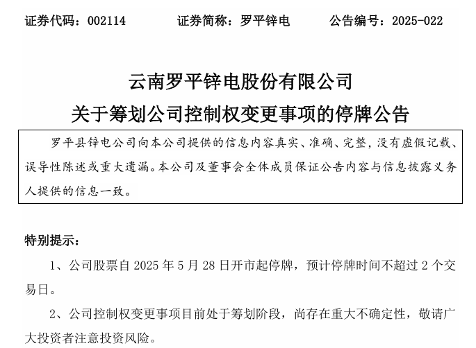 两家A股上市公司筹划控制权变更相关事宜。 罗平锌电(002114)5月27日晚间公告称,公司于2025年5月27日收到控股股东罗平县锌电公司的通知,其正在筹划公司控制权变更事宜,拟向曲靖市发展投资集团有限公司协议 ...