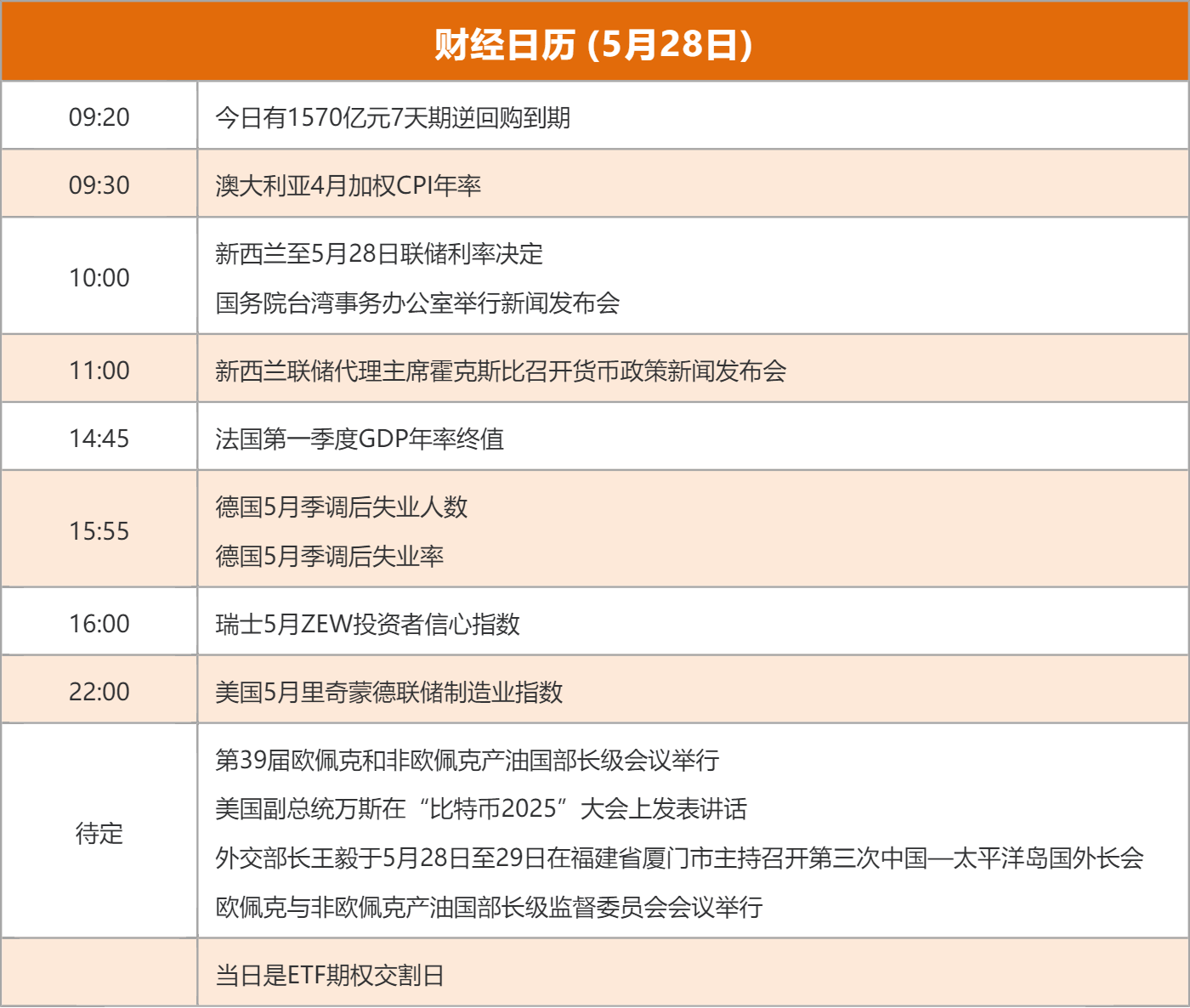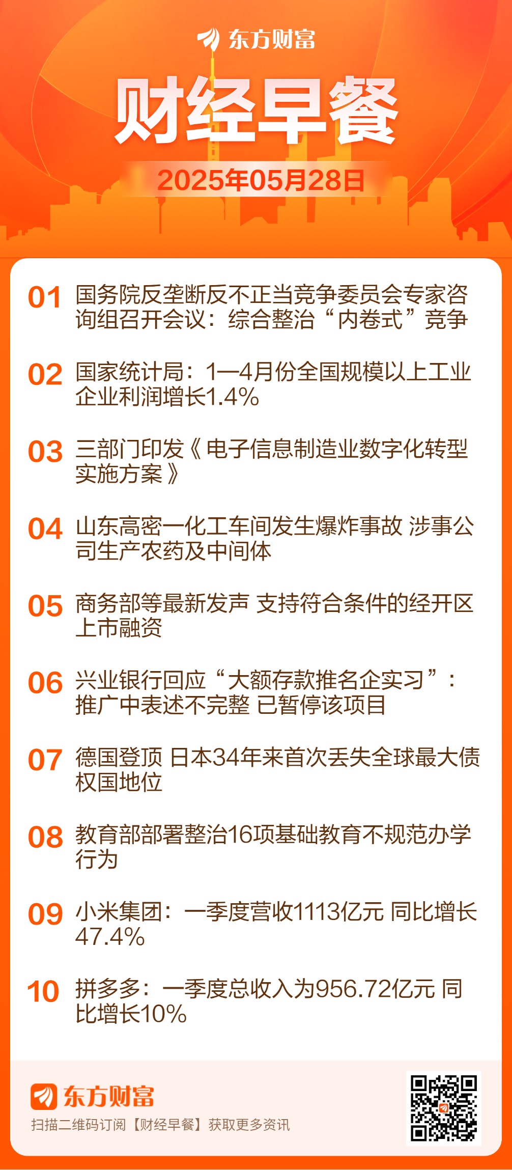 ![]() ![]() 1、市场监督管理总局:国务院反垄断反不正当竞争委员会专家咨询组全体会议在京召开。会议强调,要紧紧围绕委员会工作部署,紧扣加快构建全国统一大市场、综合整治“内卷式”竞争、加强竞争监管执法等重点任务,主动担当、积极作为,更好履行专家咨询组职责,为提升公平竞争治理能力、维护公平竞争市场秩序贡献智慧力量。 2、国家统计局:1—4月份,全国规模以上工业企业实现利润总额21170.2亿元,同比增长1.4%,规模以上工业企业中,国有控股企业实现利润总额7022.8亿元,同比下降4.4%;股份制企业实现利润总额15596.4亿元,增长1.1%;外商及港澳台投资企业实现利润总额5429.2亿元,增长2.5%;私营企业实现利润总额5706.8亿元,增长4.3%。 3、财联社:工信部等三部门印发《电子信息制造业数字化转型实施方案》。其中提到,到2027年,电子信息制造业数字化转型、智能化升级的新型信息基础设施基本完善,规模以上电子信息制造业企业关键工序数控化率超过85%,先进计算、人工智能深度赋能行业发展。典型场景解决方案全面覆盖,形成100个以上典型场景解决方案,服务能力明显增强,形成不少于100家面向电子信息制造业的专业化服务商“资源池”。 4、澎湃新闻:5月27日11时57分左右,山东高密友道化学有限公司一车间发生爆炸事故,正全力组织救援救治。涉事公司官网介绍,山东友道化学有限公司为豪迈集团股份有限公司控股子公司,该公司聚焦于高效低毒类农药及其专用中间体,致力于农药、医药及相关精细化工中间体产品的连续流技术开发、生产、销售。 5、人民财讯:针对近日网传“通过银行大额存款可获得名企实习机会”的消息,兴业银行表示,近期该行私人银行部推出菁英企业实习计划,引发公众关切和媒体报道,该行对该项目在推广中表述不完整造成的误解,深表歉意。兴业银行方面表示,鉴于该项目引起争议,经审慎评估,该行已暂停该项目。 证券时报:美国私募基金公司博龙资本管理称,拟竞购具有重要战略意义的达尔文港。该港口位于澳大利亚,目前港口的经营权由中国的企业岚桥集团所有。对此,外交部发言人表示,有关的中国企业是通过市场方式获得达尔文港的租约,其合法权益应当受到充分的保护。 证券时报网:国新办举行国务院例行政策吹风会,介绍已于日前发布的《深化国家级经济技术开发区改革创新以高水平开放引领高质量发展工作方案》有关情况。其中提到,后续如果有经开区符合上市融资条件,商务部将与有关部门予以支持。 新华网:据中国进出口银行,今年以来,进出口银行进一步提升科技金融服务的精准性、有效性、适配性,持续加大各类资源、政策、机制倾斜。截至目前,进出口银行科技贷款余额约1.4万亿元,今年以来投放超1500亿元,服务覆盖2200余家重点科技企业。 央视网:5月26日,一列满载汽车配件、家用电器和日用百货的中欧班列从新疆阿拉山口站出发驶向波兰马拉舍维奇,至此,阿拉山口铁路口岸今年通行中欧(中亚)班列突破3000列。截至目前,经阿拉山口口岸通行的中欧(中亚)班列线路达123条,覆盖德国、波兰等21个国家。 财联社:日本财务省公布的数据显示,尽管日本海外资产规模创历史新高,但却是34年来首次丢失了全球最大债权国地位。截至2024年底,日本对外净资产余额达到了533.05万亿日元(约合3.7万亿美元),较上一年度增长约13%。尽管这一数字创下历史新高,但德国在去年的对外净资产余额已达569.7万亿日元,超过了日本。 央视网:教育部部署开展基础教育“规范管理提升年”行动,重点清理整治16项不规范办学行为,包括中小学组织以选拔生源为目的的各类考试或采用各类竞赛证书等作为招生依据,利用节假日、寒暑假组织学生集体上课补课,不履行校园食品安全管理责任等。 财联社:近日,四川绵阳宣布试行4.5天弹性工作制,鼓励2.5天休假模式,这一举措引发社会对“周休2.5天”的广泛关注与期待。事实上,我国多地此前已明确出台相关鼓励政策,探索弹性作息模式以激发消费活力。 财联社:北京市经济和信息化局印发《北京市人工智能赋能新型工业化行动方案(2025年)》,其中提出,打造行业头部大模型,构建高性能通用智能体。支持企业将工业机理、数据、知识与大模型相融合,打造适应性强、数据处理与智能决策能力好、可感知环境和自主协同的通用智能体,突破传统工业软件重度依赖经验、适应环境受限、智能化不足的困境。 财联社:据悉,部分车企、下游公司及行业机构接到相关部门通知参与研讨会,主要议题是促进二手车流通高质量发展,对“零公里”二手车及进一步促进二手车流通消费相关内容进行研讨。 中国基金报:随着新质生产力的蓬勃发展,高端制造升级的过程中也伴随着材料体系的升级。市场专家表示,作为我国基础性、战略性和先导性产业,新材料产业连续14年保持两位数增长,并有望在今年总产值突破10万亿元大关,在AI、人形机器人、绿色能源、制造业升级等背景下,我国新材料产业正迎来前所未有的发展机遇。 新京报:财政部官网消息,4月份,全国共销售彩票577.45亿元,同比增加22.88亿元,增长4.1%,继续保持平稳增长态势。其中,福利彩票机构销售191.75亿元,同比增加4.11亿元,增长2.2%;体育彩票机构销售385.70亿元,同比增加18.77亿元,增长5.1%。 央视新闻:今年暑期档将于6月1日火热开启,截至目前,已有