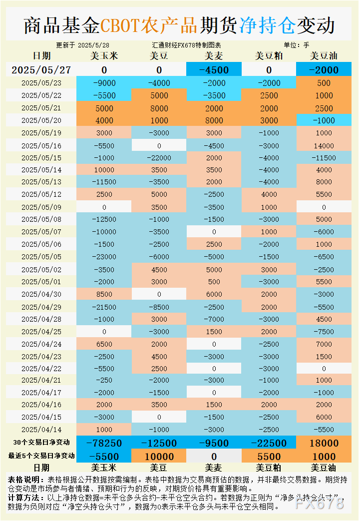周三(5月28日),芝加哥期货交易所(CBOT)谷物与油籽期货市场呈现震荡分化的走势,市场情绪受到美国作物评级、国际供需动态及持仓调整的综合影响。小麦期货因美国作物评级低于预期而小幅反弹,玉米期货受播种进度放缓支撑,微幅上涨,而大豆和豆粕市场则因南美供应压力和关税言论缓和而波动有限,豆油则受到外部植物油市场走强的提振。持仓数据显示,大宗商品基金在小麦和豆油市场增加净空头,反映出谨慎的市场情绪,而玉米、大豆和豆粕的多空持仓平衡则暗示市场方向尚未明朗。本文将结合最新持仓变动、基差动态及基本面因素,深入分析小麦、大豆、玉米、豆油和豆粕的期货市场走势,并展望未来方向。 ![]() 小麦期货市场在本周初经历了显著回调,周二CBOT软红冬小麦基准期约下跌2.6%,因美国大平原及黑海地区的降雨改善了土壤墒情,强化了市场对全球供应充足的预期。然而,周三小麦期货反弹,基准期约上涨0.5%至5.31美元/蒲式耳,受到美国农业部(USDA)最新作物评级报告的支撑。报告显示,截至5月25日,美国春小麦优良率仅为45%,低于市场最低预期,冬小麦优良率也仅为50%,低于分析师平均预测,但仍为2020年以来同期最高水平。低迷的作物评级引发市场对美国小麦产量的担忧,推动短线空头回补。 持仓数据方面,大宗商品基金在5月27日净卖出4500手小麦期货合约,最近30个交易日持续增加投机性净空头,反映出市场对小麦价格的看跌情绪。然而,结合基差动态,当前美国硬红冬小麦现货基差保持稳定,农户因期货价格上涨持观望态度,这可能限制短期跌幅。国际市场方面,俄乌局势引发的黑海地区供应不确定性虽有所缓解,但印度限制小麦库存的政策为全球市场提供一定支撑。展望未来,小麦期货可能在5.00-5.50美元/蒲式耳区间震荡,需关注美国产区天气和国际招标动态。 大豆:播种进度超均值,市场情绪趋于平衡 大豆期货周三小幅下跌0.1%至10.62美元/蒲式耳,市场受到多重因素的博弈影响。USDA作物进展报告显示,截至5月25日,美国大豆播种进度达到76%,高于五年均值68%,但低于分析师预期的78%,出苗率50%与历史均值持平。播种进度的超预期推进缓解了市场对种植延迟的担忧,但南美供应压力依然显著。南美作物专家下调2024/25年度阿根廷大豆产量预测至4850万吨,较此前减少150万吨,但巴西大豆出口预计在5月达到1403万吨,全球供应充裕限制了大豆价格上行空间。 持仓数据显示,5月27日大宗商品基金在CBOT大豆期货的多空持仓平衡,最近5个交易日增加净多头4000手,但30个交易日整体呈现净空头增仓趋势,表明市场对大豆价格的长期预期偏谨慎。基差方面,5月装船的CIF大豆驳船基差报63美分/蒲式耳,较上周五上涨1美分,6月基差持稳于67美分/蒲式耳,反映美国国内需求稳定但出口竞争力不足。未来6-10日,美国大豆主产州预计气温偏高、降水增加,可能进一步改善作物生长条件。预计大豆期货短期将在10.50-11.00美元/蒲式耳区间盘整,需关注巴西出口节奏和美国国内压榨数据。 玉米:优良率低于预期,短期支撑有限 玉米期货周三小幅上涨0.2%至4.60-1/4美元/蒲式耳,受到USDA首份2025季玉米优良率报告的支撑。报告显示,截至5月25日,美国玉米优良率为68%,远低于市场预期的73%,为2019年以来最差开局。Allendale首席分析师Rich Nelson指出,播种初期天气不佳和出苗缓慢是主要原因。未来6-10日,美国玉米主产州94.44%地区气温将高于正常水平,56%地区降水偏多,可能改善作物生长,但短期内低优良率仍为市场提供支撑。 持仓数据方面,5月27日大宗商品基金在玉米期货的多空持仓平衡,最近5个交易日增加净空头9000手,30个交易日净空头持续累积,显示市场对玉米价格的看跌预期。基差方面,5月装船的CIF玉米驳船基差报69美分/蒲式耳,6月基差为68美分/蒲式耳,均与上周五持平,反映美国国内需求稳定但出口市场承压。巴西2024/25年度玉米产量预期上调进一步加剧全球供应压力。玉米期货短期可能在4.50-4.80美元/蒲式耳区间震荡,需关注美国产区天气和南美出口动态。 豆油:外部市场提振价格,空头增仓暗示谨慎 豆油期货周三上涨0.4%,7月期约交易区间在49.00-50.18美分/磅,受到马来西亚棕榈油期货走强及美国生物燃料政策乐观预期的支撑。埃及政府表示其植物油储备可满足未来四个月需求,全球植物油市场紧张为豆油价格提供支持。然而,持仓数据显示,大宗商品基金周二净卖出2000手豆油期货合约,最近30个交易日增加净多头,表明市场情绪在看涨与谨慎间摇摆。成交量从周一的70938手降至66271手,空盘量为225774手,反映市场活跃度略有下降。 基差方面,美国国内豆油基差保持坚挺,出口市场需求为价格提供支撑。南美大豆供应增加和全球需求疲软仍是主要利空因素,预计豆油价格短期在48.00-51.00美分/磅区间波动。未来走势将依赖美国国内压榨产量和生物燃料政策进展,需密切关注国际植物油市场动态。 豆粕:供需平衡限制波动,市场观望情绪浓厚 豆粕期货周三收盘互有涨跌,7月期约微涨0.1美元至296.3美元/短吨,交易区间在293.5-298.0美元/短吨,市场波动有限。伊朗采购12万吨阿根廷或巴西豆粕,欧盟豆粕进口量同比增长26%至1730万吨,显示全球需求稳定,但美国国内压榨量高企和南美供应充裕限制价格上行。USDA数据显示,12月美国豆粕压榨量创历史新高,但需求增长乏力,市场情绪趋于谨慎。 持仓方面,5月27日大宗商品