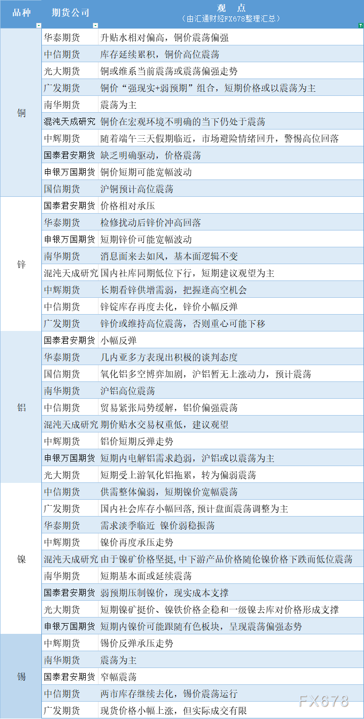 期货公司观点汇总一张图 5月28日有色系 铜 锌 铝 镍 锡等 更多详见本文的汇通财经特制图 铜 随着端午三天假期临近 市场避险情绪回升 警惕高位回落 铜或维系当前震荡或震荡偏强走势 锌 期看锌供增需弱 把握逢高空机 ...