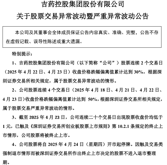 *ST吉药将在29日被摘牌,不进入退市整理期。 *ST吉药(300108)5月28日晚间公告称,公司股票已被深圳证券交易所决定终止上市,将在2025年5月29日被摘牌。公司股票因触及交易类强制退市情形被深圳证券交易所作出终止上市决定,不进入退市整理期。 ![]() 根据公告,*ST吉药于2025年5月26日收到深圳证券交易所《关于吉药控股集团股份有限公司股票终止上市的决定》(深证上〔2025〕第517号),鉴于公司股票被深圳证券交易所决定终止上市,根据《深圳证券交易所创业板股票上市规则(2024年修订)》《关于退市公司进入退市板块挂牌转让的实施办法》等的相关规定,公司应当在股票被终止上市后及时做好相关工作,以确保公司股份在摘牌后四十五个交易日内可以进入全国中小企业股份转让系统有限责任公司依托原证券公司代办股份转让系统设立并代为管理的两网公司及退市公司板块(以下简称“退市板块”)挂牌转让。 据了解,公司已聘请山西证券股份有限公司担任公司主办券商,并与其在2025年5月27日签订了《委托股票转让协议》,委托其为公司提供股份转让服务,办理交易所市场的股份退出登记、股份重新确认、退市板块的股份初始登记、股票挂牌及提供股份转让服务等相关事宜。 截至2025年3月31日,*ST吉药股东户数为28056户。 行情方面,*ST吉药已于4月24日停牌,停牌前,该公司股价报0.21元/股。 值得注意的是,早已锁定面值退市的*ST吉药在停牌前的最后一个交易日,仍有资金博弈,公司以0.19元/股的跌停价开盘后,成交短时间放量,股价一度冲高至0.23元/股,换手率29.42%,全天成交额近4000万元。 当天收盘后,*ST吉药发布了关于股票交易异常波动暨严重异常波动公告。公司股票连续2个交易日(2025年4月22日、4月23日)收盘价格跌幅偏离值累计达到30%。同时,连续4个交易日(4月18日、4月21日、4月22日、4月23日)收盘价格跌幅偏离值累计达到50%,根据深交所相关规定,属于股票交易严重异常波动的情形。 ![]() 公开资料显示,*ST吉药全称为吉药控股集团股份有限公司,公司于2000年成立,主营业务涵盖医药工业(中西成药生产)、医药商业(批发、代理)、医药零售、医疗医养(以医疗结合的养老服务)等医药大健康产业。*ST吉药前身为双龙股份,2010年登陆创业板,主营化工业务。2014年,公司通过收购金宝药业进入医药领域,开启“化工+医药”双主业格局。2017年更名为吉药控股后,开始通过并购加速扩张。自2019年开始,公司陷入连续亏损状态。 从公司披露的财务数据来看,公司2024年年报显示,报告期内,公司实现营收3.33亿元,同比下降3.69%;净利润亏损4.39亿元,上年同期亏损3.49亿元。 ![]() 公司2025年一季报显示,报告期内,公司实现营收6374万元,同比下降15.53%;净利润亏损4517万元,去年同期亏损4085万元。 ![]() (文章来源:证券时报) |