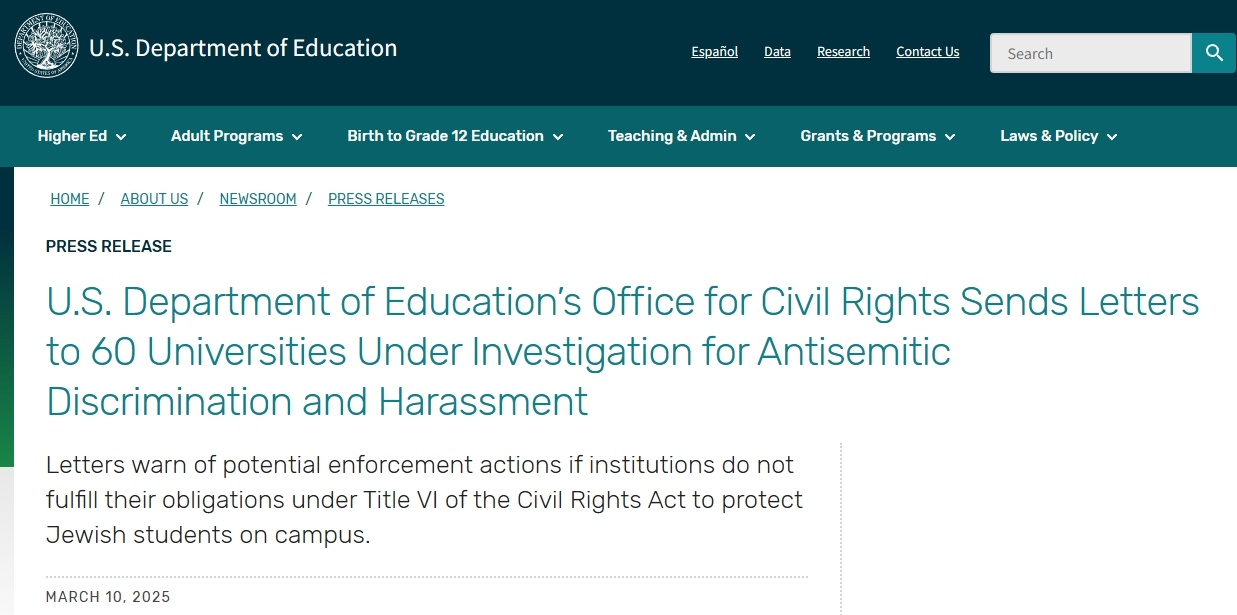 美国政府与哈佛大学的“交锋”正当胶着时,又将攻击力转向了加州大学。一名司法部官员称,政府打算就反犹太主义指控起诉加州大学。 美官员:将提起大规模诉讼 美国司法部民权司高级法律顾问利奥·特雷尔正在领导一个打击反犹太主义的多机构工作组。他在5月27日福克斯新闻的一次采访中表示,美政府将“对加州大学系统”和“东海岸、西海岸、中西部”的其他大学提起大规模诉讼。 特雷尔称:“预计联邦政府将提起仇恨犯罪指控。” 该指控基于美国民权法第七条。该法保护人们免受基于“种族、肤色、宗教、性别或国籍”的就业歧视。 除了哈佛大学等,该工作组还专门针对加州大学洛杉矶分校、南加州大学和加州大学伯克利分校进行了调查。 加利福尼亚大学,简称加州大学,建立于1868年,是美国加州一个由十个大学校区组成的州立大学系统。 加州大学:反对一切歧视 加州大学发言人在一份声明中表示,该大学“憎恶反犹太主义,并正在努力解决、打击和消除整个系统中各种形式的反犹太主义”。 加州大学战略和关键沟通高级主管Rachel Zaentz说,“加州大学仍然完全专注于加强我们的计划和政策,以根除反犹太主义和一切形式的歧视。” 此外,加州大学表示,继续公开且明确地谴责各种形式的犹太人至上主义,并采取了强有力的措施,保护所有学生——包括犹太社区的成员——免受任何类型的非法歧视。 加州大学尚未公布工作组是否访问过校园,或向加州大学洛杉矶分校和加州大学伯克利分校索取了哪些信息。 南加州大学发言人没有回答有关工作组是否参观了校园的问题。 加州大学早已被“盯上” 今年3月,美国教育部门向60所大学及其校区发送信件,警告他们要“保护犹太学生”,否则将“面临联邦执法行动”。这些校园包括了四个加州大学校园——圣地亚哥、圣塔芭芭拉、伯克利和戴维斯,以及南加州大学、波莫纳学院、斯坦福大学、钱普大学、圣莫尼卡学院和萨克拉门托州立大学。 ![]() △美国教育部网站截图 同样在3月,美国司法部表示已启动一项民权调查,调查加州大学的反犹太主义指控,称其律师认为该州旗舰高等教育系统对犹太教员工存在“潜在模式”的歧视。 (文章来源:央视新闻) |