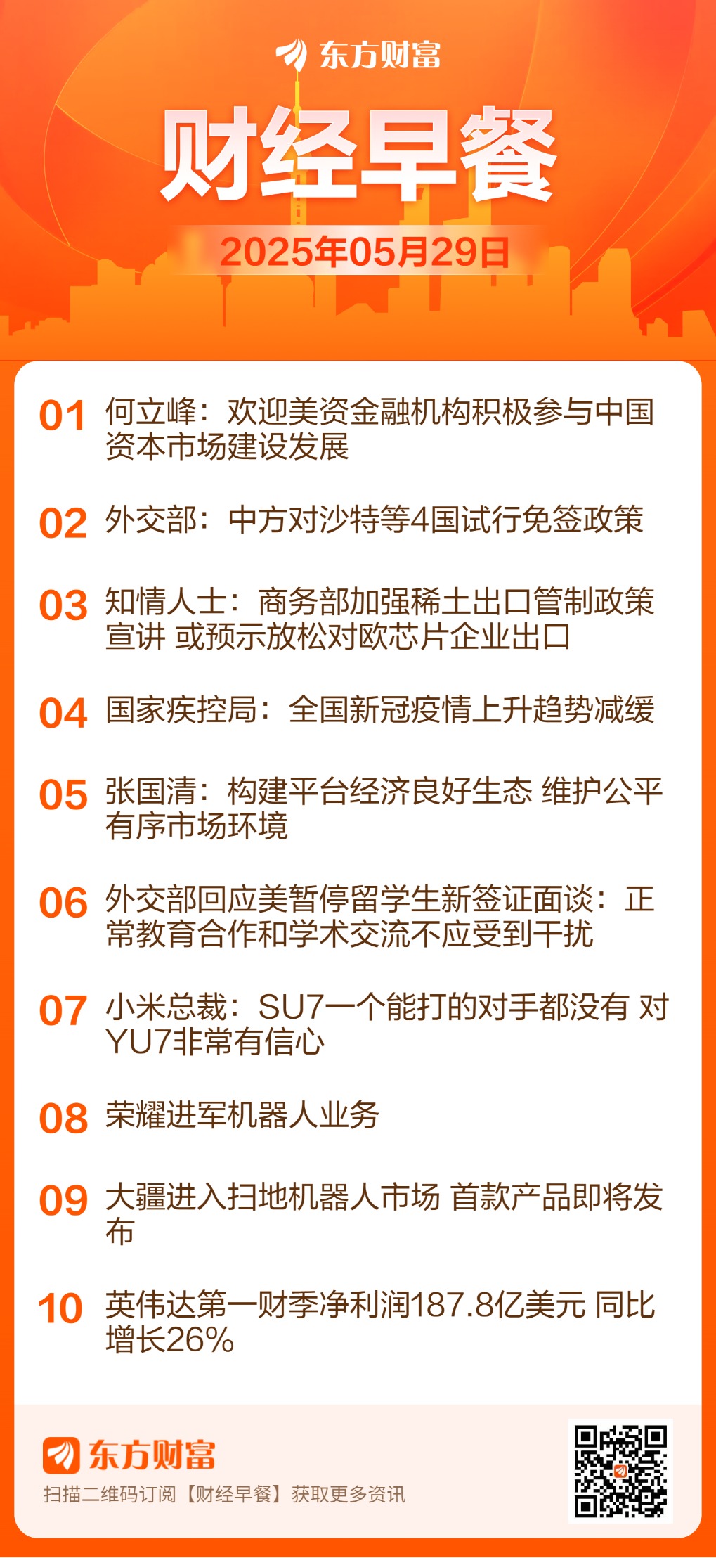 ![]() ![]() 1、新华社:中共中央政治局委员、国务院副总理何立峰在人民大会堂会见美国摩根士丹利联席总裁丹·辛克维兹。何立峰表示,中国坚持以高水平开放推动高质量发展,将为中国和全球经济激发活力、增添动力,欢迎摩根士丹利在内的更多美资金融机构和长期资本持续深化对华互利合作,积极参与中国资本市场建设发展。 2、人民日报:外交部发言人在答记者问时表示,为了进一步便利中外人员往来,中方决定扩大免签国家范围,自2025年6月9日至2026年6月8日,对沙特、阿曼、科威特、巴林持普通护照人员试行免签政策,上述四国持普通护照人员来华经商、旅游观光、探亲访友、交流、访问、过境不超过30天可以免办签证入境。加上2018年全面互免签证的海合会成员国阿联酋和卡塔尔,中方已经实现对海合会国家免签全覆盖。 3、商务部:中欧半导体上下游企业座谈会在北京召开。会议强调,中欧在全球半导体供应链中均占据重要地位,加强合作符合双方利益。当前国际形势复杂严峻,不稳定不确定因素增多,中国将继续扩大高水平对外开放,为企业提供公平、稳定、透明、可预期的政策环境,支持中欧半导体企业充分发挥各自互补优势,依法合规深化经贸合作,坚决反对单边主义和霸凌行径,努力维护全球半导体供应链安全与稳定。 4、中国日报网:据悉,商务部在近日召开的中欧半导体上下游企业座谈会上,对稀土出口管制政策进行了宣讲,加强与中欧芯片企业在稀土管制出口上的沟通,以维护全球产业链稳定。另一位知情人士表示,这一举动意味着中国或将放松针对中欧半导体企业产业链的稀土出口管制,以更好维护全球产业链稳定。 5、新华社:目前,全国新冠疫情上升趋势减缓,大多数省份疫情已达高点或呈下降趋势。优势流行株为XDV变异株的第六代亚分支NB.1.8.1,致病力未发生明显变化,疾病临床严重程度未发生明显变化。 新华社:中共中央政治局委员、国务院副总理张国清在上海市调研促进平台经济健康发展和市场监管有关工作。他强调,要深入贯彻习近平总书记重要指示批示精神,落实党中央、国务院决策部署,聚焦推动高质量发展,全面强化市场监管领域治理能力,推动构建平台经济良好生态,维护公平有序市场环境。 新华社:据教育部官网发布,2025年全国高考报名人数1335万人。教育部会同国家教育统一考试工作部际联席会议成员单位,强化统筹谋划、周密研究部署、精心组织实施,指导各地用心用情用力做好考试组织和考生服务工作,全力以赴实现“平安高考”目标任务。 证券时报网:保险资金长期投资改革试点出现“新力量”。与前两批试点多为大型险企不同,第三批试点参与机构有望新增多家中小保险公司。参与试点的险资机构在数量和类型上实现新突破的同时,险资参与试点的模式也将有所创新。金融监管总局局长李云泽日前表示,将进一步扩大保险资金长期投资的试点范围,近期拟批复600亿元,为市场注入更多的增量资金。这宣告了长期投资试点的第三批开启,待这600亿元批复后,险资长期投资试点规模将增至2220亿元。 央视新闻:特朗普政府下令美使领馆暂停留学生新签证面谈。对此,外交部发言人表示,注意到有关动向,中方一贯认为正常的教育合作和学术交流不应当受到干扰,我们敦促美方切实保障包括中国留学生在内的各国留学生的合法正当权益。 财联社:英国内政部的最新数据显示,寻求移居英国的美国人数量创下历史新高。在截至今年3月的一年中,超过6600名美国公民申请英国公民身份,较前一年增长了30%。在美国总统特朗普去年11月当选和今年1月重返白宫期间,这一数字出现了大幅飙升。2025年前三个月,共有1931名美国公民申请英国公民身份,创下自二十年前有记录以来之最;2024年最后一个季度的申请数量位居第二,为1723人。 证券时报网:新西兰央行宣布,将基准利率下调25个基点至3.25%。这是新西兰央行连续第六次降息,符合市场预期。新西兰央行暗示,在全球风险上升之际将进一步放松政策。分析人士指出,尽管新西兰央行为进一步降息留下了空间,但通胀水平上升可能会引发市场对下次降息时间的疑问。 央视网:今年1—4月,我国可再生能源新增装机1.28亿千瓦,其中,新增风电装机1996万千瓦,新增光伏装机1.05亿千瓦。预计全年风电光伏发电装机新增2.8亿千瓦。 央视网:国产大飞机C919商业运营两周年以来,运营航线持续“上新”,航线网络覆盖全国16个城市,规模化运营全面加快。目前,国航、东航、南航共18架C919飞机投入商业运营,执飞20余条商业航线,安全飞行超3.6万小时,累计运输旅客超过205万人次。 央视网:市场监管总局在全国部署开展老年人药品、保健品虚假宣传专项整治工作,依法查处价格欺诈、违法广告、非法添加等侵害老年人合法权益、破坏市场竞争秩序的行为。 北京商报:当银发经济遇上财富管理新蓝海,个人养老金理财市场正迎来“加速跑”,中国理财网发布第八批个人养老金理财产品名单,随着中银理财新增2只产品入市,个人养老金理财产品总数已扩容至35只,固收类产品以超八成的绝对占比成为市场主力,为投资者的养老资产筑牢稳健底盘。 财联社:大行领衔引发银行业集体下调存款利率以来,理财子公司迎来降息规模推广的小高潮。3月底,个别理财公司宣布产品费率降至0。当时,渤银理财表示,为回馈投资者,