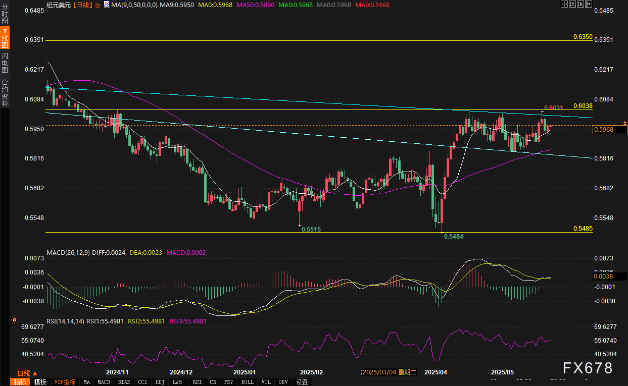 周四 5月29日 亚洲时段 纽元兑美元延续企稳态势 汇价目前站稳9日均线 0 5950 上方 并远离50日均线 0 5860 显示短期多头占优 但上方仍面临0 6000关键心理关口的压制 日内焦点集中于矩形整理形态的突破方向 基本面 ...