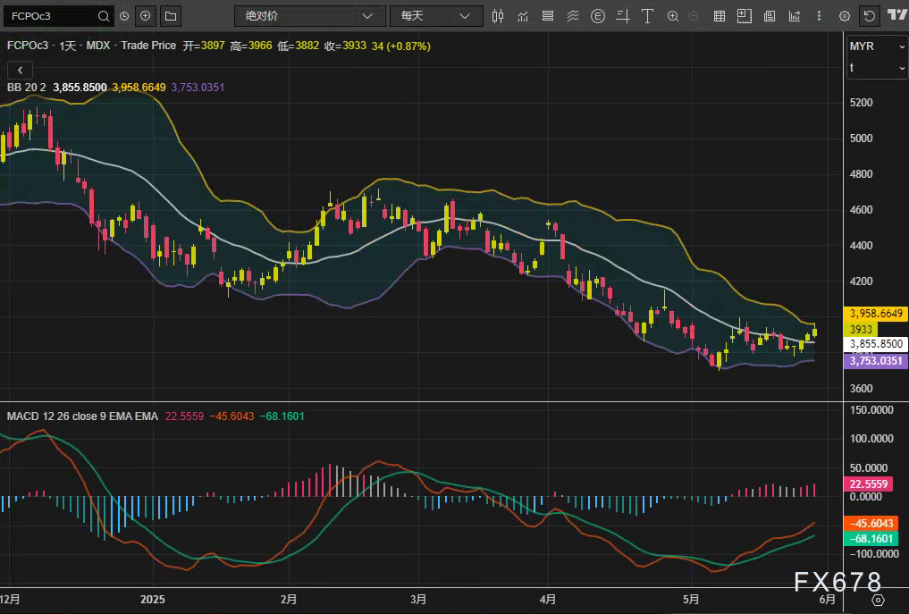马来西亚棕榈油期货连续第五个交易日收涨 截至今日收盘 主力8月合约FCPOc3报3933林吉特 吨 日内涨幅0 87 技术指标显示 价格站稳布林通道中轨 3855林吉特 上方 MACD柱状图收窄至 68 16 短期动能有所修复 市场驱 ...