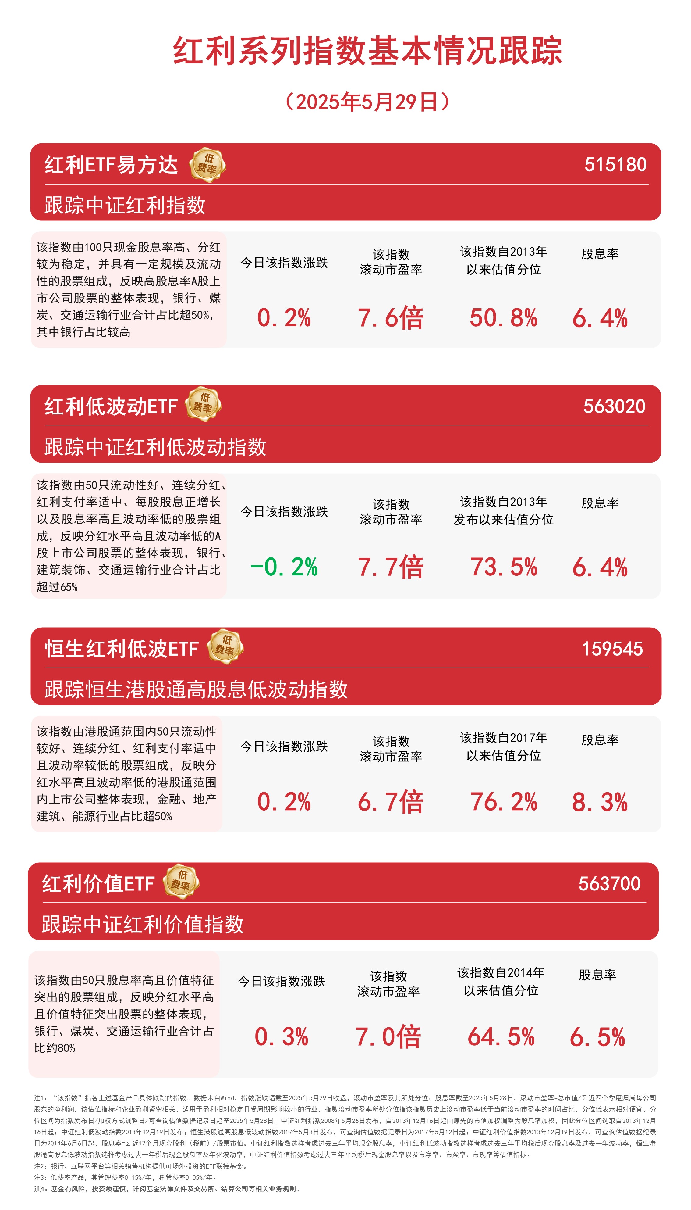 截至收盘,中证红利价值指数上涨0.3%,中证红利指数、恒生港股通高股息低波动指数均上涨0.2%,中证红利低波动指数下跌0.2%。