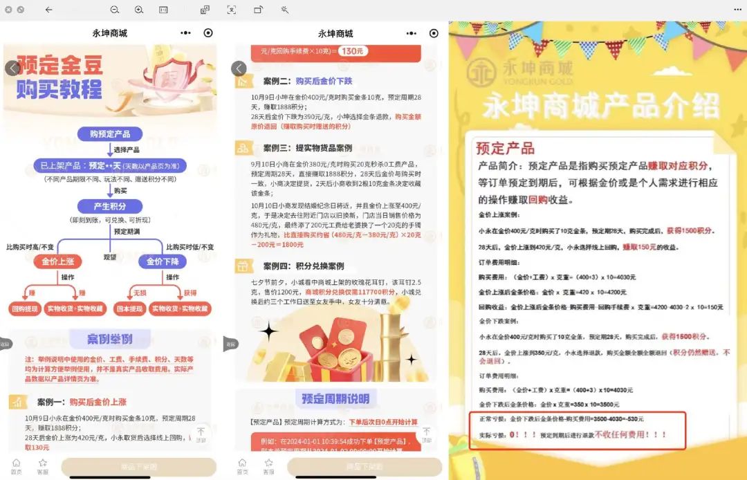 黄金圈再现“大劫案”。有多位投资者向蓝鲸新闻爆料称,黄金综合服务商永坤黄金兑付异常。 永坤黄金在全国多地拥有实体门店,业务覆盖黄金销售、回收、贵金属T+D、私募基金等领域。 据悉,永坤的黄金投资、托管业务面世多年,日前出现到期无法赎回的情况,浙江、四川、安徽等多省市均有投资者被套数百、上千万元,累计金额上亿元。公安机关已对该案立案侦查。 金价下跌也不赔的投资? 多位受访者称,他们是本月20号左右发现永坤兑付异常的。原本应该在19号到账的黄金产品收益迟迟未到,工作人员的回复从“在催财务打款”逐渐变成“联系不上财务”。 ![]() 在永坤黄金线上商城,客户可以大盘金价“预定黄金”,周期从3-88天不等。所谓“预定”,是指用户无法马上获得实物黄金,到期后用户可以选择回购提现或者收下实物。 官方介绍称,即便购买后金价下跌,购买金额也能原价退回。客户不但不用承担金价变动的损失,反而可以用购金赠送的积分兑换商城礼品如金币金豆、油卡、饰品等。 ![]() 这听起来似乎稳赚不赔。因此有投资者将信用卡等用于购买该业务,目前欠款数十万。 除线上预购黄金产品外,投资者还可以通过线下门店、公司业务员签订黄金购买及代管合同。代管周期一般为半年或一年,年化收益在7%-9.5%左右。 ![]() 相关产品收益率 / 受访者供图 多位线下投资者称,永坤的这项业务面世已久,身边不少亲友参与投资,一买就是十多年。因为此前都是正常还本付息,部分投资者新签约的合同金额就超过千万。 “线下参与投资的金额会更大,光我身边三家人已经3000多万了。” 有受访投资者坦言。 永坤黄金之所以能吸引大量投资者,一定程度上与其不断扩张的线下门店有关。受访投资者告诉蓝鲸新闻记者,当地有不少永坤黄金的线下门店,“我们当地门店挺多的,所以很多亲戚、同事都会互相介绍,也因为是线下所以有不少老年人也参与投资理财了。” 蓝鲸新闻查询永坤黄金官网发现,该公司号称业务涵盖黄金冶炼、加工、销售、回购等众多领域,在全国范围拥有百余家黄金销售机构,甚至在中亚、非洲、欧洲等地区开展黄金珠宝产业链项目。 不过据永坤黄金官方公众号的“门店分布”信息,其国内门店数量大约在30余家左右,大部分聚集在浙江省内。 天眼查APP显示,浙江永坤控股有限公司成立于2014年,注册资本1.02亿元,为汪国海100%控股公司。 据《1818黄金眼》报道,2021年永坤黄金就曾出现无法兑付的案例。 ![]() 永坤黄金的异象 事实上从年初开始,永坤黄金就已经有一些“异样”。 莉莉很早就在同事的介绍下开始通过购买“预定金条”的形式在永坤黄金进行投资理财。“我记得最开始玩的时候里面的预定周期一般都是7天,但后来变成了15天、18天,现在周期已经变成了28天,”预定周期越来越长让莉莉有一丝不安,但由于提现依然正常,也没有放在心上。 永坤黄金承诺投资者三个工作日内会完成提现,但2025年春节后开始打款速度就变慢了,“以前说三个工作日内通常隔天就能到账,但今年就变成第三个工作日才会到账,5月15号我再申请就再也没有到账的信息了,”莉莉发现出事儿以后联系到了商城官方客服,但对方一直以“财务在根据自己的进度来,请耐心等待”回复,直到5月20日,客服账号再也没有回复过任何信息。 但即便如此,莉莉依然坚持在小程序里申请提现,“前前后后我投进去40多万,真的没办法和家里交代,只能期待有一丝丝奇迹了。” 蓝鲸记者浏览永坤黄金线上商城发现,目前可预定产品已全部下架,秒杀价格为7800多元的“新人体验产品”售出超500份。五一期间,官方还推出了积分加码活动。直到20号当天,还有业务员在咨询客户要不要续存。 记者尝试致电永坤黄金官方客服、加盟热线,截至发稿未能接通。 有受访者透露,21号就有大量投资者到公司总部维权。公司高管称董事长目前不在国内,财务也未到场。公司展厅已关闭,柜面未摆放黄金。 ![]() 永坤黄金展厅关闭 / 受访者供图 记者从维权群了解到,本月23号开始就有很多人都去到了永坤黄金总部所在地的经侦队和派出所,相关部门已对此案立案侦查。 永坤黄金兑付异常背后 永坤黄金兑付异常背后,相关商业模式疑点重重。 金价下跌也不赔、保本保利的产品真实存在吗?合法合规吗? 据界面新闻报道,广强律师事务所合伙人,非法集资辩护中心主任曾杰表示,“从托管回购合同看,该公司已经将贵金属消费行为转变为需要许可证的金融投资行为。因为其不仅在签订购买合同的同时签订了回购合同,并且确定了相应的利润或者收益,这种利润或者收益会转化成一种借款利率或者投资利率。” 曾杰认为,由于存在针对不特定对象进行融资且给予保本付息承诺(包括对于“保本保利”的宣传),在没有法定许可证或牌照的情况下,涉嫌违反我国刑法中关于非法吸收公众存款及集资诈骗的相关规定,同时也涉嫌违反《防范和处置非法集资条例》。 此外据第一财经报道,永坤黄金是珠宝首饰零售商,实际并没有经营黄金资产管理业务的资质。 企查查数据显示,永坤黄金的经营范围仅包含珠宝首饰零售(国标行业F5245)。其黄金托管、租赁业务已超出实物黄金销售范畴,或类似黄金资产管理产品。 北京岳成律师事务所高级合伙人岳屾山此前接受记者采访时表示,根据《中国人民银行办公厅