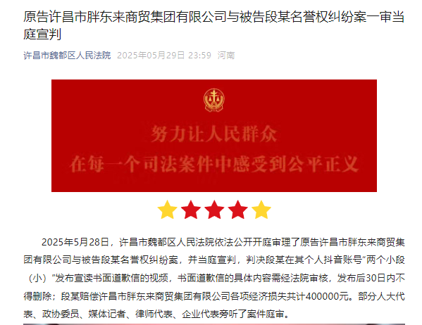 据许昌市魏都区人民法院官方微信号5月29日深夜消息,2025年5月28日,许昌市魏都区人民法院依法公开开庭审理了原告许昌市胖东来商贸集团有限公司与被告段某名誉权纠纷案,并当庭宣判,判决段某在其个人抖音账号“ ...