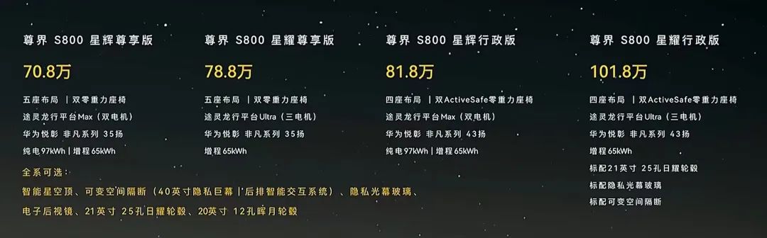 5月30日晚,华为鸿蒙智行与江淮汽车(600418)合作推出的尊界品牌首款车型——尊界S800在深圳国际会展中心(宝安)正式发布。 ![]() 华为常务董事、终端BG董事长余承东正式发布尊界S800 时娜摄 新车提供四个版本,售价区间为70.8万元至101.8万元。此前该车的预售价为100万至150万元。 ![]() 据发布会现场介绍,尊界S800将于6月26日开启先行者计划交付,限量599台,将于8月中旬规模批量交付。 据鸿蒙智行披露,尊界S800上市一小时大定突破1000台,先行者计划仅剩219席。 “华为不造车,但我们帮助车企造好车。”华为常务董事、终端BG董事长余承东在现场表示。 ![]() 发布会后,消费者现场体验尊界S800 时娜摄 作为目前鸿蒙智行家族最贵的车型,尊界S800自官宣以来颇受市场关注。据悉,相对于其他百万级豪车,尊界S800主打智能化标签。 据余承东介绍,尊界S800创新智慧电动门,联动毫米波雷达与固态激光雷达,可以智能感应动静态障碍物,来自动调节开启角度,最大开门角度达77°,并且支持隔空手势开关门。新车还引入了NearLink华为星闪连接技术,定位精度较蓝牙钥匙提升5倍,解闭锁精准度提升6倍。 驾控方面,尊界S800首发搭载途灵龙行平台,首创时空推理悬架,实现颠簸与弯道的事前预判,连续减速带和凹坑如履平地;首发智驾爆胎稳定控制辅助,超机动应急处理无惧爆胎。 性能方面,余承东介绍,尊界S800纯电双电机零百加速4.3秒,增程三电机零百加速4.7秒,增程双电机零百加速4.9秒。 此外,尊界S800搭载巨鲸电池平台2.0,底部五层硬核防护,高安全热电分离架构,双大面液冷板、热电分离防高压短路,降温速率提升2倍。 江淮汽车董事长项兴初、宁德时代董事长曾毓群也现身发布会现场。 ![]() 江淮汽车董事长项兴初在发布会上发表演讲时娜摄 “我们汇聚全球顶尖人才,成立了尊界上海设计中心,组建了超5000人的专属团队,新建了尊界超级工厂,目前投入已超百亿元。”项兴初说。 江淮与华为自2019年就达成战略合作,2023年12月,双方进一步签署了《智能新能源汽车合作协议》,基于华为智能汽车解决方案,在产品定义、品牌营销等各领域全面合作,着力打造超豪华智能新能源汽车品牌尊界。同时,与华为联手打造的尊界超级工厂也于2024年12月16日在合肥落成,规划年产能20万辆,预计达产后产值将超1000亿元。 ![]() ![]() 图片来源:信达证券研报 曾毓群则在现场表示,尊界S800的电池非常有价值,希望车主将来想回收时提前和宁德时代预约,“我们可以帮你买回来”。 在续航充电方面,尊界S800首发800V雪鸮智能增程平台,支持6C超充电芯体系,10%至80%最快充电仅10.5分钟。增程版双电机CLTC综合续航1333km,纯电续航400km。增程版三电机CLTC综合1200km,纯电续航365km。采用超高密度800V高压纯电平台,纯电版双电机搭载96.7kWh电池,CLTC综合续航702km,支持5C超充电芯体系,10%至80%最快充电12分钟。 (文章来源:上海证券报) |
