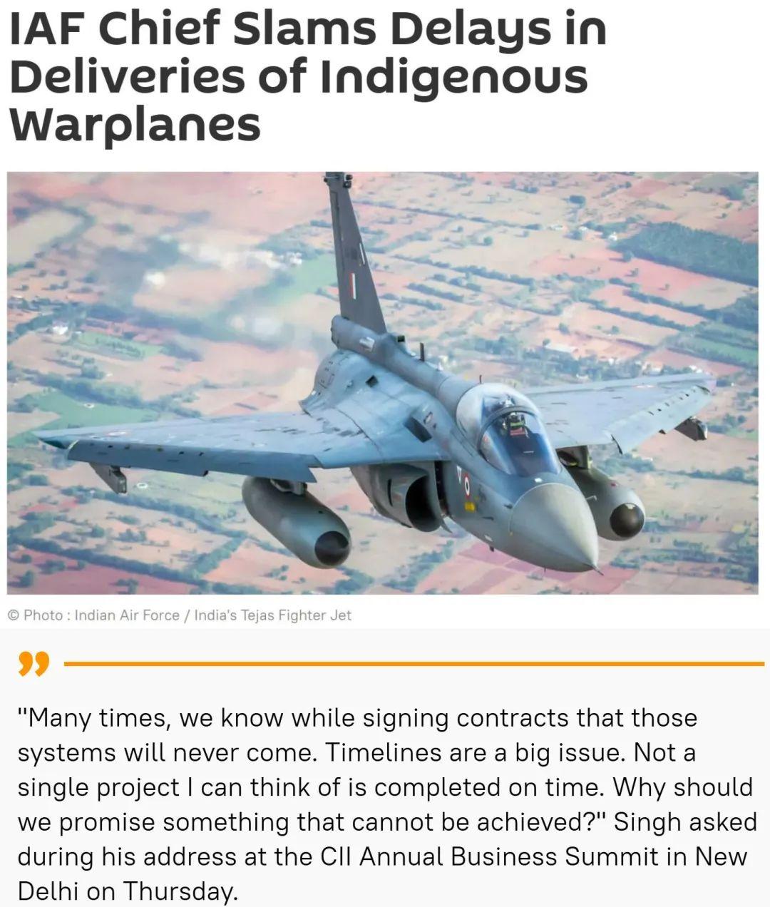 据彭博新闻社网站5月31日报道,印度军方首次证实其在5月份与巴基斯坦的冲突中损失了数目不详的战斗机,同时声称这场为期四天的冲突从未接近核战争爆发点。 印度国防参谋长阿尼尔·乔汉31日在新加坡出席香格里拉对话会期间接受彭博电视台采访时说:“重要的并非飞机被击落,而是它们为什么会被击落。” 他声称巴基斯坦方面关于其击落6架印度战机的说法是“绝对错误的”,但他拒绝说明印度具体损失了多少架战机。 乔汉在被问及战斗机被击落一事时回答说:“它们为什么会被击落,到底犯了什么错误——这些才是重要的。数字并不重要。” 乔汉说:“好的一面是我们能够理解我们所犯下的战术错误,予以补救、改正,然后在两天后再次让我们所有战机起飞,打击远程目标。” 报道称,这是印度政府或军方官员迄今为止就5月7日爆发的印巴冲突中印度战斗机的遭遇所作出的最直接表态。 本月早些时候,巴基斯坦总理夏巴兹·谢里夫声称巴方击落了6架印度战斗机,这一说法尚未得到独立证实。印度政府此前一直避免就印度是否在交战中损失飞机发表评论。 报道称,这场战事是这两个拥有核武器的邻国在半个世纪以来最严重的冲突。 乔汉拒绝评论美国总统唐纳德·特朗普关于美国帮助避免了一场核战争的说法,但他表示,暗示任何一方曾接近于使用核武器未免过于“牵强”。他说:“我个人感觉在常规作战行动与核门槛之间还留有很大空间。” 印度空军高官不满:“国产战机”到底何时能交货 据俄罗斯卫星通讯社5月29日报道,印度空军参谋长辛格在印度工业联合会举办的年度商业峰会上严厉批评本国的航空制造业,称印度大型国防项目的落实没有如期进行,包括国产“光辉”战机在内的战斗机向空军交付均出现延迟。 辛格指出,根据2021年与印度斯坦航空有限公司签订的价值4800亿卢比(约合404亿元人民币)的合同,印度国防部所定购的83架“光辉”战斗机至今一架都没有交付。 ![]() △俄罗斯卫星通讯社报道截图 “光辉”多用途单引擎超音速战斗机研发工作的60%由印度斯坦航空有限公司和印度国防部负责。 印度政府1983年批准了“光辉”战斗机的研发工作,最初计划于1994年列装印度空军部队,但直到2015年该机才正式服役。 ![]() △《今日印度》网站报道截图 环球资讯广播《环球军事报道》主编魏东旭指出,印度航空工业体系不给力,让花大价钱买国货的印度空军十分不满。 印度斯坦航空有限公司研制印度国产的LCA“光辉”轻型战斗机的项目周期接近30年。战斗机研制出来后,在政府的施压下,印度空军采购了这款战斗机,但是装备时,战机已经落后了。随后印度斯坦航空公司对“光辉”进行了技术升级和改造,但是改进型战机的交付工作又出现了延迟,效率非常低。印度航空工业体系之所以出现这种情况,一是缺乏核心技术,二是很多子系统需要从国外采购,这不仅导致成本增加,在技术升级过程中也会遭遇海外技术的限制。结果花大价钱买来的印度国产战斗机,即使是升级改进型号,也不能满足印度空军需求。魏东旭分析认为,战斗机延迟交付给印度空军埋下隐患。 印度空军原本计划用LCA“光辉”及其改进型战机大批量替代老旧的米格-21战斗机,但是“光辉”产量提不上来,改进型交付又出现延迟,印度空军飞行员只能冒险驾驶老旧且容易出故障的米格-21战斗机进行训练或是执行空中巡逻任务。国产战斗机的交付出了问题,说明印度整个航空工业体系的制造能力存在缺陷,会减缓印度空军战斗机的更新换代速度,这将给印度空军的发展带来风险和隐患。 (文章来源:中国新闻网) |
