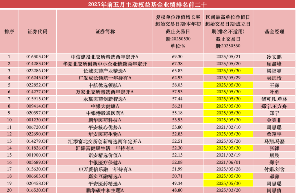 5月交易已落下帷幕。 从主动权益基金(其中包括普通股票型基金、偏股混合型基金、灵活配置型基金,仅计算初始基金,下同)前五个月业绩表现来看,收益最高者如中信建投北交所精选两年定开A今年以来收益率为69 ...