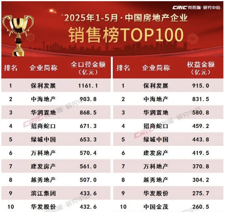 5月31日,克而瑞地产研究中心发布2025年1-5月中国房地产企业销售TOP100排行榜的报告。 报告显示,从全口径销售金额来看,今年前5个月,保利发展(600048.SH)以1161.1亿元的销售额排名第一,紧随其后的为中海 ...