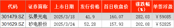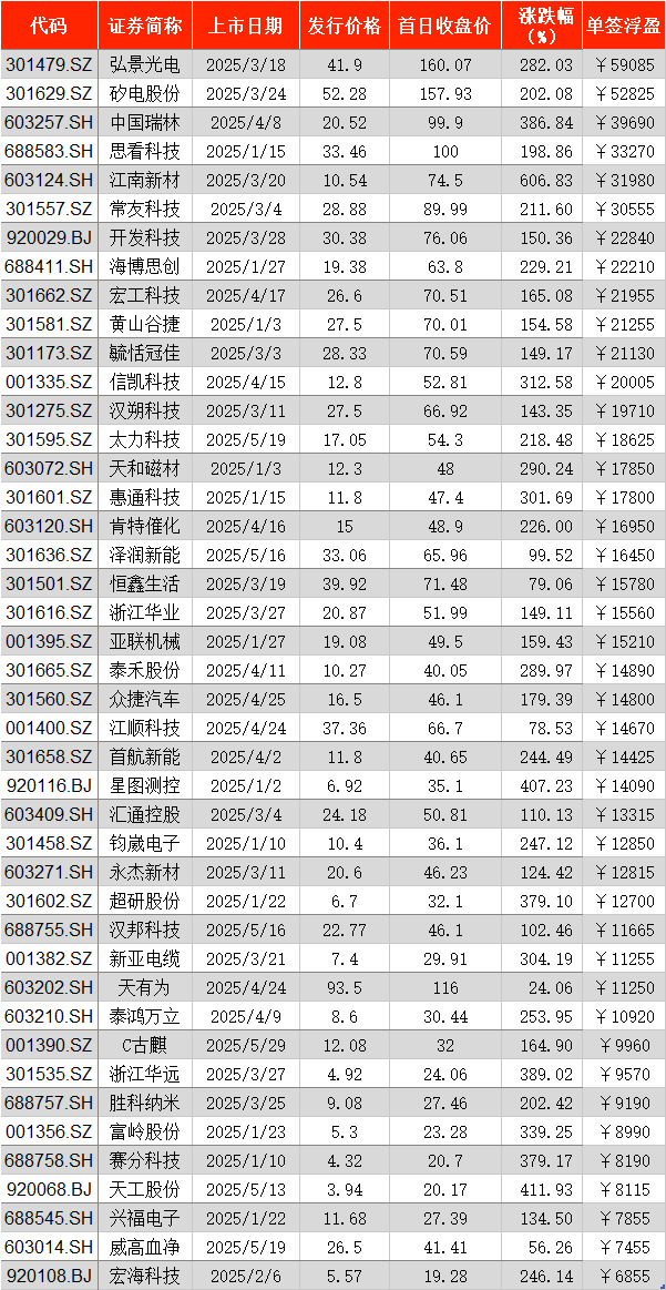 今年前五个月新股实现“0”破发。 澎湃新闻根据数据统计,2025年1月至5月,共有43只新股上市,不仅实现零破发,还有33只新股的单签浮盈过万,占比高达77%。 其中,3月18日上市的弘景光电(301479)以5.91万元的单签浮盈排名第一。3月24日上市的矽电股份(301629),单签浮盈同样超过5万元,以5.28万元排名第二。 而在首日涨跌幅方面,江南新材首日收盘的涨幅高达606.83%,也是前5个月唯一一只首日涨幅超过600%的新股。天工股份(920068)、星图测控(920116)的首日涨幅紧随其后,均超过400%,分别达411.93%和407.23%。 ![]() 中一签最高获利5.91万元 今年前5个月上市的新股中,有2只新股首日收盘单签浮盈超过5万元。 3月18日,弘景光电上市,发行价格为41.9元/股,首日股价收报160.07元/股,涨幅282.03%。按收盘价计算,投资者单签浮盈5.91万元。 3月24日,矽电股份上市,发行价格为52.28元/股,首日股价收报157.93元/股,涨幅202.08%。按收盘价计算,投资者单签浮盈5.28万元。 ![]() 此外,中国瑞林、斯堪科技、江南新材、常友科技4只新股,首日单签浮盈均超过3万元。 4月8日,中国瑞林上市,发行价格为20.52元/股,首日股价收报99.9元/股,涨幅386.84%。按收盘价计算,投资者单签浮盈3.97万元。 1月15日,思看科技上市,发行价格为33.46元/股,首日股价收报100元/股,涨幅198.86%。按收盘价计算,投资者单签浮盈3.32万元。 3月20日,江南新材上市,发行价格为10.54元/股,首日股价收报74.5元/股,涨幅606.83%。按收盘价计算,投资者单签浮盈3.20万元。 3月4日,常友科技上市,发行价格为28.88元/股,首日股价收报89.99元/股,涨幅211.60%。按收盘价计算,投资者单签浮盈3.06万元。 此外,宏工科技、黄山谷捷、毓恬冠佳、信凯科技的首日单签浮盈均超过2万元,分别为2.20万元、2.13万元、2.11万元、2.00万元。 ![]() 38只新股首日涨幅翻番 涨幅方面,今年前5个月,43只新股中,有38只新股的首日涨幅翻番。 其中,3月20日上市的江南新材,首日涨幅高达606.83%,排名第一。按收盘价计算,投资者单签浮盈3.20万元。 天工股份、星图测控首日涨幅紧随其后,首日涨幅均超过400%,分别为411.93%、407.23%,单签浮盈分别为8115元和1.41万元。 浙江华远(301535)、中国瑞林(603257)、赛分科技(688758)、超研股份(301602)、富岭股份(001356)、信凯科技(001335)、新亚电缆(001382)、惠通科技(301601)首日收盘的涨幅均超过300%。 其中,首日涨幅分别为389.02%、386.84%、379.17%、379.10%、339.25%、312.58%、304.19%和301.69%;单签浮盈分别为9570元、3.97万元、8190元、1.27万元、8990元、2.00万元、1.13万元和1.78万元。 ![]() 发行价30元以上的新股首日单签浮盈均超万元 高价股方面,今年前5个月,发行价格超过30元/股的新股,首日单签浮盈均超过万元。 其中,年内至今发行价格最高的“最贵新股”天有为(603202),发行价格为93.5元/股,首日收报116元/股,涨幅为24.06%,首日单签浮盈为1.13万元。 3月24日上市的矽电股份(301629),发行价格超过50元/股,首日收报157.93元/股,涨幅超过200%,单签浮盈高达5.28万元。 3月18日上市的弘景光电,发行价格超过了40元/股,首日收报160.07元/股,涨幅282.03%,单签浮盈达5.91万元。 此外,恒鑫生活(301501)、江顺科技(001400)、思看科技(688583)、泽润新能(301636)、开发科技(920029)等新股,发行价格均超过30元/股,首日涨幅分别为79.06%、78.53%、198.86%、99.52%、150.36%,首日单签浮盈分别为1.58万元、1.47万元、3.33万元、1.65万元和2.28万元。 ![]() (文章来源:澎湃新闻) |