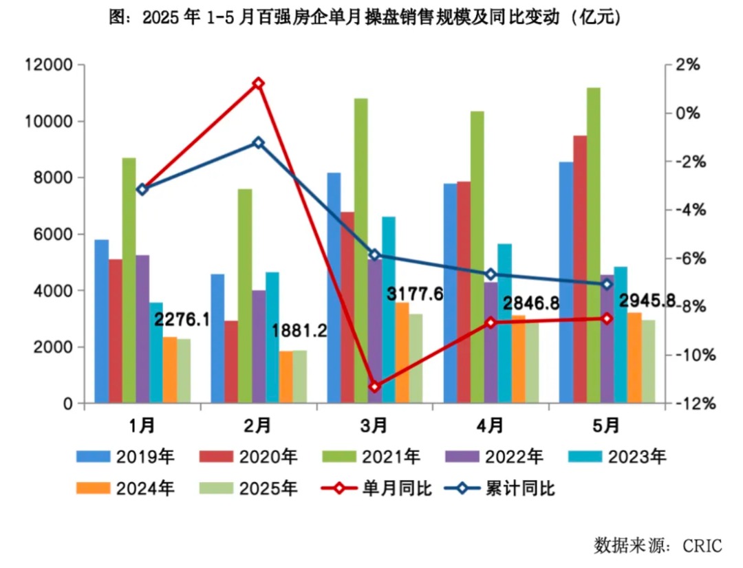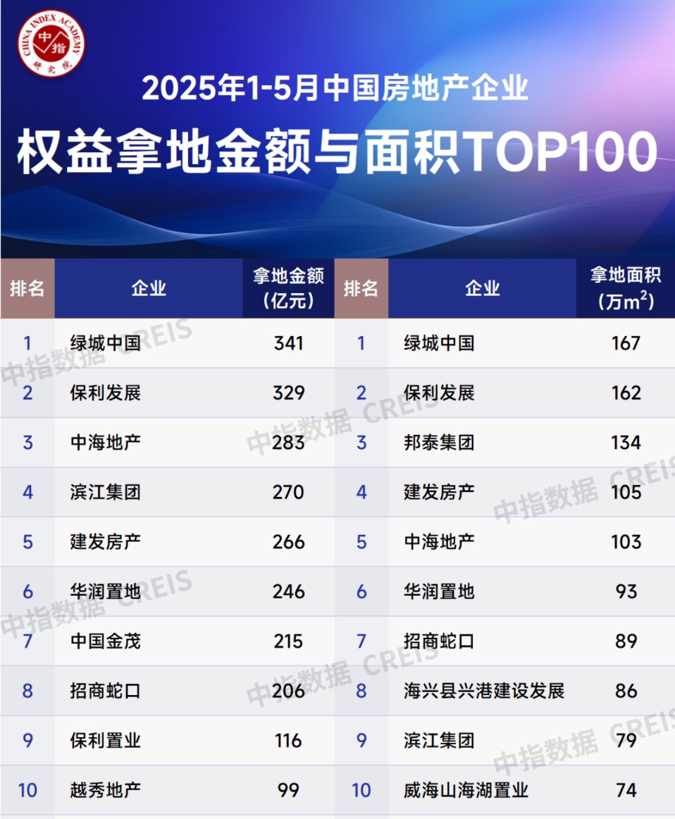今年以来,房地产市场整体延续止跌回稳态势。 5月30日—31日,中指研究院、克而瑞、亿翰智库等机构陆续发布2025年前5月百强房企销售业绩及拿地金额榜单。中指研究院数据显示,前5月,百强房企销售总额14436.4 ...