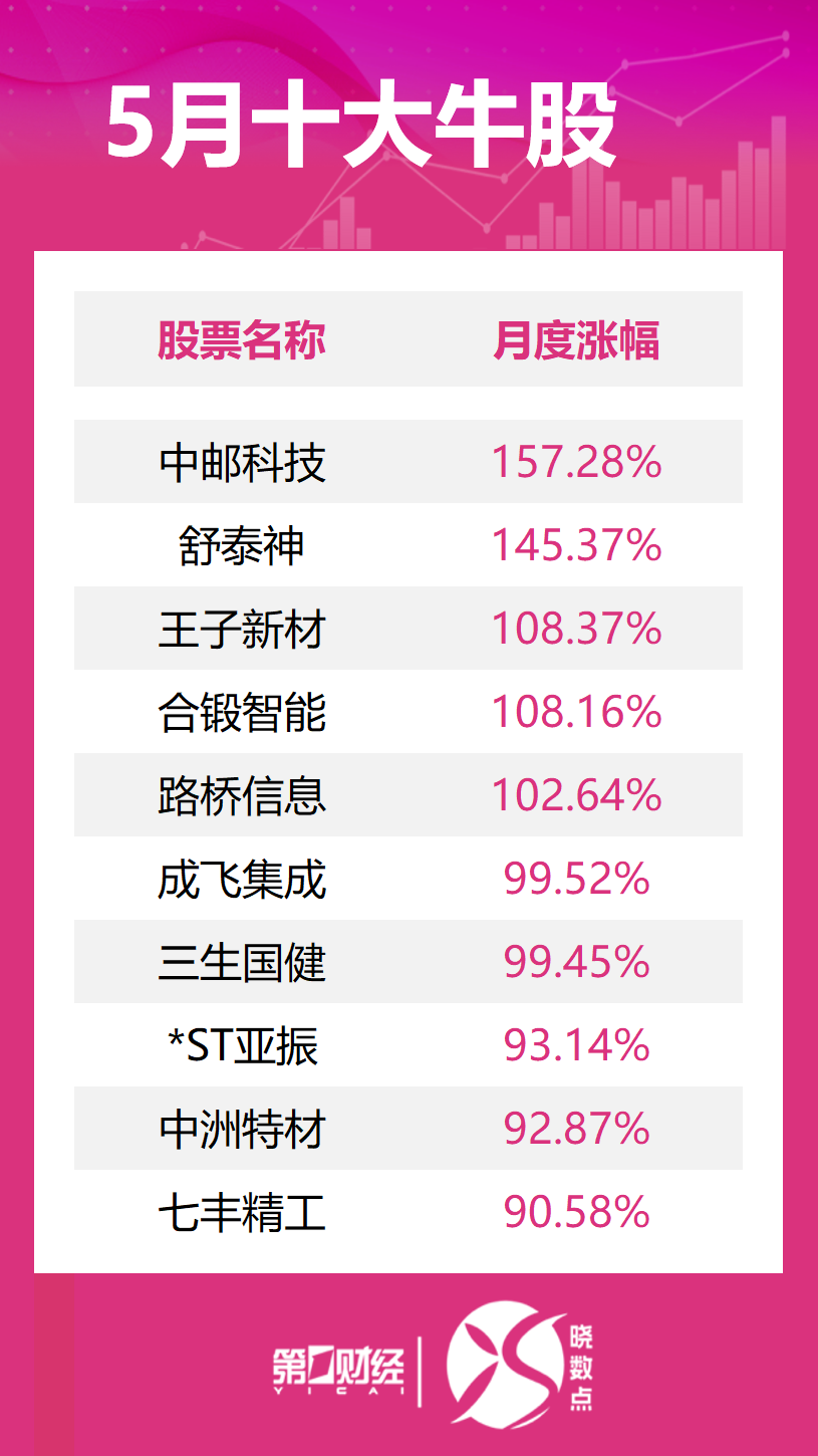 截至5月30日收盘,沪指月内累计涨2.09%,深证成指累计涨1.42%,创业板指累计涨2.32%。 ![]() 在剔除最近半年上市的新股后,截至5月30日收盘,5月十大牛股中涨幅最大的为中邮科技,累计涨幅157.28%;其次为舒泰神,累计涨幅145.37%。这10只股票中有5只股票涨幅超过100%,这10股涨幅均超过90%。月度十大牛股里还有一只ST股*ST亚振,月累计涨幅93.14%。 ![]() NO.1 中邮科技 157.28% 在物流行业降本增效与智能化升级双重驱动下,无人物流车赛道近期持续火热。5月6日至30日,无人车概念股中邮科技股价由26元上涨至67元,月内累计涨幅达157.28%,其中有2个交易日录得20%涨停,截至5月30日,公司市值达91亿元。 中邮科技在异动公告中指出,不存在公司应披露而未披露的重大信息或可能对公司股票价格产生较大影响的事项,包括但不限于并购重组、股份发行、债务重组、业务重组、资产剥离和资产注入等重大事项。公开资料显示,中邮科技主要从事智能物流系统的研发、设计、生产、销售并提供相关服务,产品主要包括智能分拣系统、智能传输系统、智能专用车等。 NO.2 舒泰神 145.37% 创新药概念股舒泰神月内有2个交易日录得20%涨停。舒泰神5月22日晚公告,公司多个在研项目属于创新型生物制品。资料显示,公司主营自主知识产权创新药物,特别是生物药物的研发、生产和营销。核心产品包括国家一类新药“苏肽生”和清肠便秘药物“舒泰清”。 NO.3 王子新材 108.37% 可控核聚变概念股王子新材月内有7个交易日涨停,5月25日晚,王子新材公告,公司近日股价涨幅较大,涨速较快。公司关注到部分媒体将公司列入可控核聚变概念,公司控股子公司宁波新容电器科技有限公司仅为可控核聚变中的磁体电源项目提供电容产品,是核聚变磁体电源装置中一个组成部件,非全套装置,产品单价和在装置中的价值占比较低,该业务收入占公司主营业务收入比例很小,对公司短期业绩影响有限。 王子新材表示,当前离可控核聚变商业应用还有很长的距离,公司控股子公司宁波新容参与到该类项目获得订单的可持续性存在重大不确定性。目前,市场上除王子新材外,亦有其他供应商可提供同类产品,整体市场呈现一定的竞争态势。 NO.4 合锻智能 108.16% 同为可控核聚变概念股的合锻智能月内有4个交易日涨停,合锻智能5月19日在投资者互动平台回复提问表示,在可控核聚变的应用项目中,公司具有托卡马克装置核心零部件制造能力,同时已获得相关订单,目前订单金额在2亿多元。 NO.5 路桥信息 102.64% 北交所上市公司路桥信息月内有2个交易日获得30%涨停,公司属于移动支付和车联网概念股。资料显示,路桥信息的主营业务是交通领域信息化产品和解决方案的提供、运维、运营,公司的主要产品是轨道交通、智慧停车、公路与城市交通、创新与衍生业务。 NO.6 成飞集成 99.52% 成飞集成月内有9个交易日涨停,成飞集成多次公告表示,公司目前主营业务以汽车零部件和工装模具为主,航空零部件业务为辅(截至2024年末,汽车零部件和工装模具收入占比为96.91%,航空零部件业务收入占比为1.74%)。经公司自查,目前生产经营活动一切正常,市场环境、行业政策没有发生重大调整,内部生产经营秩序正常。 NO.7 三生国健 99.45% 5月19日至5月22日,三生国健走出四连板。5月20日早间,三生国健公告,公司及关联方三生制药和沈阳三生制药有限责任公司共同授予辉瑞PD-1/VEGF双特异性抗体SSGJ-707在全球(不包括中国内地)的独家开发、生产、商业化权利。辉瑞保留通过支付额外付款获得在中国大陆商业化许可产品的权利。 根据协议,辉瑞将支付12.5亿美元不可退还且不可抵扣的首付款、最高可达48亿美元的开发、监管批准和销售里程碑付款,以及根据授权地区产品销售额计算得到的两位数百分比的梯度销售分成。而上述12.5亿美元的首付款,再度刷新国产创新药授权出海首付款纪录。 NO.8 *ST亚振 93.14% *ST亚振月内有14个交易日涨停,公司此轮股价大涨和控股股东变更关系较大。*ST亚振4月17日公告称,控股股东正在筹划股份协议转让,可能导致公司控制权发生变更。 一周后,该公司再次披露,控股股东已签署协议,将持有的该公司29.99996%,转让给吴涛及其一致行动人范伟浩。交易完成后,该公司实际控制人将由高伟、户美云、高银楠变更为吴涛。5月30日晚,*ST亚振公告,本次协议转让股份过户登记手续已完成。*ST亚振称,吴涛将协调自身优质资源,为公司在流动资金、企业管理、资产结构等方面提供支持。 公开资料显示,*ST亚振是家居企业,主要从事中高端海派经典及海派现代家具产品的研发、生产与销售。吴涛现任济南域潇集团执行董事、总经理,持有济南域潇集团80%股份,为济南域潇集团实控人,还任上海域潇稀土股份有限公司董事,持股13.88%。 NO.9 中洲特材 92.87% 可控核聚变概念股中洲特材月内有4个交易日录得20%涨停,中洲特材5月23日晚披露股票交易严重异动公告称,公司注意到近期“可控核聚变”相关概念受市场关注较大,公司主营高温耐蚀合金产品,所有产品均尚未实际应用于可控核聚变领域。 NO.10 七丰精工 90.58% 军工股七丰精工月内有两个交易日录得30%涨停,5月21日晚,七丰精工在投资者关系活动记录表中表示,2024年公司营收同比增长10.02%,未来瞄准航空航天和轨道交通领域增长目标,深化国内外市场双循环,构建全球化布局,拓展多元化高端应用