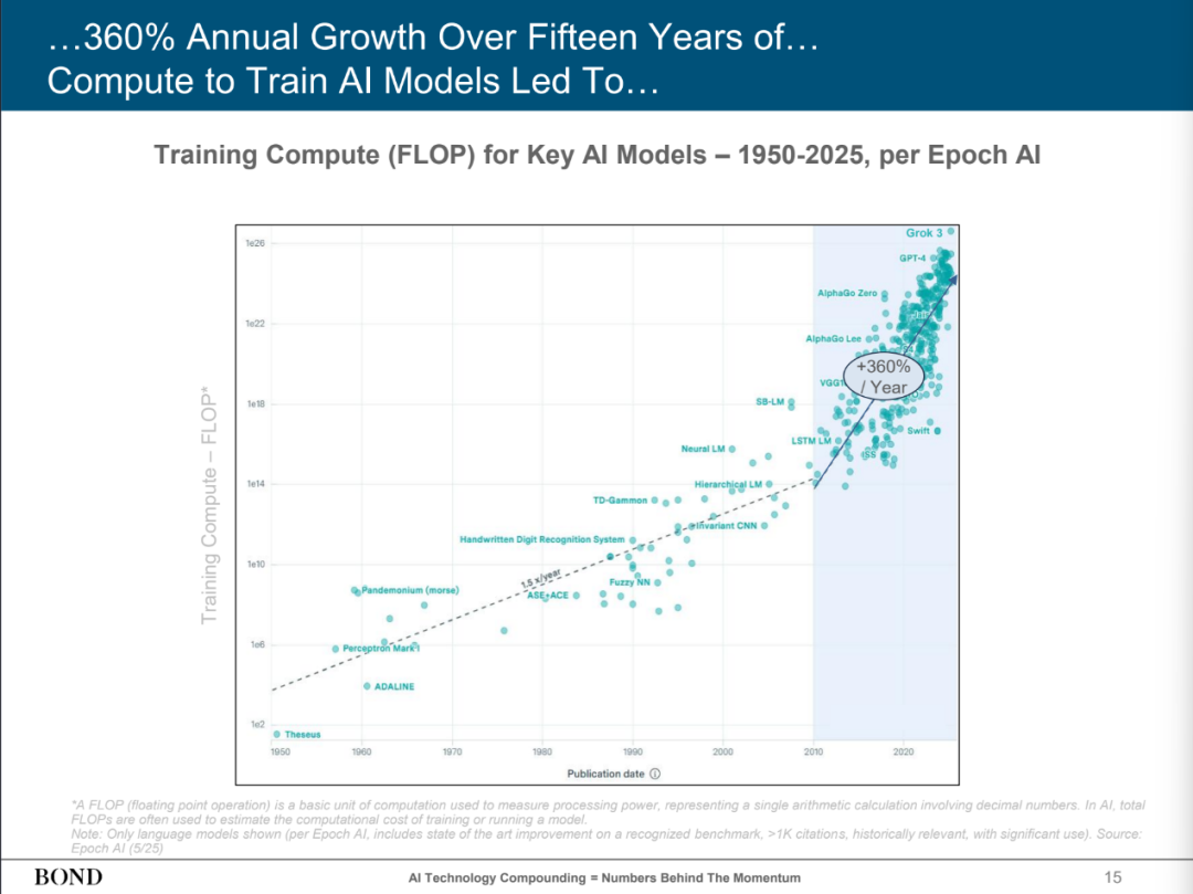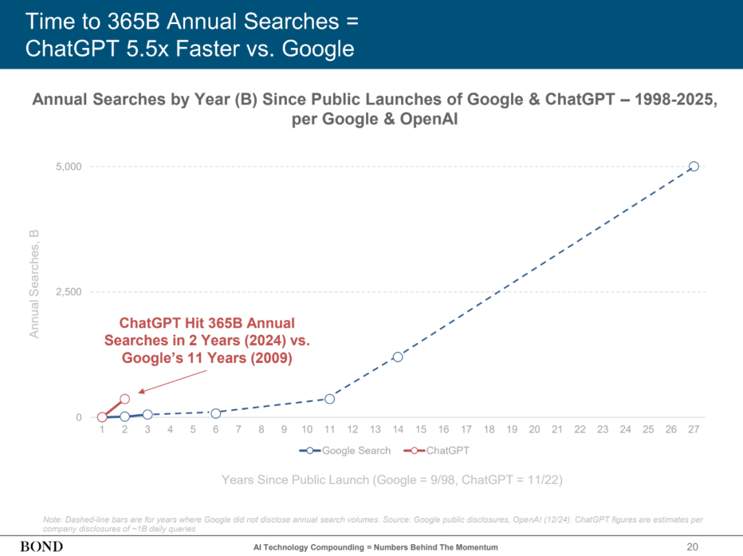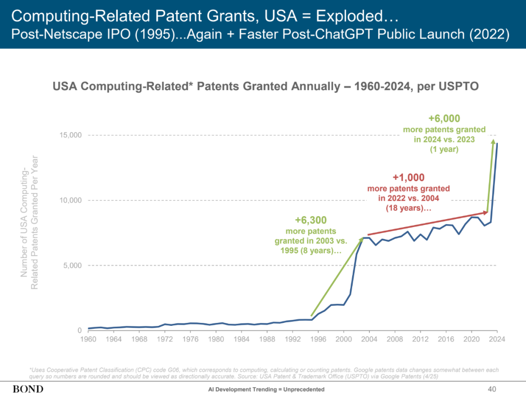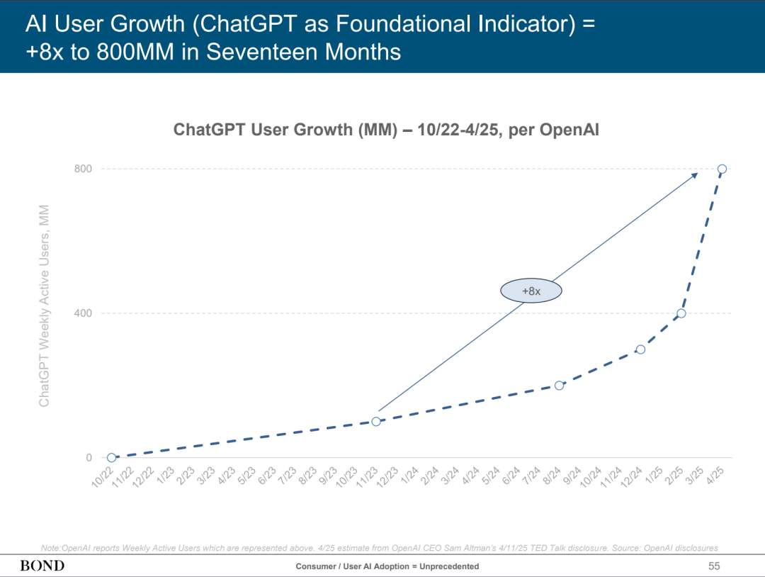 当地时间5月30日,玛丽·米克尔(Mary Meeker)发布了长达340页的“AI趋势报告”。报告显示,AI的发展速度前所未见,用户增长、使用量和资本支出均呈现出爆炸式增长,其影响力可能远超技术本身。 ![]() 玛丽·米克尔是美国风险投资家,曾就职于摩根士丹利和凯鹏华盈(Kleiner Perkins),于2018年创立了自己的风投公司邦德资本(BOND)。她主要专注于互联网与新技术领域投资,被誉为“互联网女王”。 AI发展速度前所未有 报告显示,在消费者、开发者、企业和政府部门中,AI的使用正在前所未有地激增。与互联网1.0革命的技术起步于美国,然后稳步向全球扩散不同的是,ChatGPT一下子登上了世界舞台,并在全球大部分地区同时增长。 具体来看,作为衡量算力的基本计量单位,浮点运算次数在2010年以后开始增速显著增加,年增长率达到360%。 ![]() 值得注意的是,ChatGPT年搜索量达到3650亿的时间为两年,而谷歌用了11年,ChatGPT的增速是谷歌的5.5倍。 ![]() 如果以美国计算相关专利授权数量为例,可以发现,第一次加速是在1995年,标志着互联网时代的开始。2004年起,其增速放缓,标志着互联网时代的发展也开始变慢。在2022年ChatGPT发布之后,专利数量又一次开始爆发式增长,而且比1995年那次更快。 ![]() AI用户的增速同样前所未有,ChatGPT的用户数量曾在17个月内翻了8倍。 ![]() 中国正在引领开源竞赛 为何说AI爆炸式发展的影响力可能远超技术本身? 玛丽·米克尔在报告中直言,在开源模型领域,中国正在引领开源竞赛。 在玛丽·米克尔看来,OpenAI的GPT-4或Anthropic的Claude等闭源模型通常性能更强、更易于使用,因此也受到企业、消费者和政府青睐。但闭源模型往往需要数月的计算时间和数百万美元的支出,并且还是一个不透明的“黑箱”。 随着大语言模型的成熟和竞争的加剧,开源模式因其较低的成本、不断迭代的功能以及对开发人员和企业更广泛的可及性而兴起。此类模式可供任何人免费使用、修改和构建,因此普遍受到初创企业、研究人员/学者和独立开发人员的青睐。 再看国内各AI公司,开源模型已成为主要发力方向之一。 5月29日,DeepSeek宣布,DeepSeekR1模型已完成小版本升级,当前版本为DeepSeek-R1-0528。据介绍,DeepSeek-R1-0528仍然使用2024年12月所发布的DeepSeek V3 Base模型作为基座,但在后训练过程中投入了更多算力,显著提升了模型的思维深度与推理能力。更新后的R1模型在数学、编程与通用逻辑等多个基准测评中取得了当前国内所有模型中首屈一指的优异成绩,并且在整体表现上已接近其他国际顶尖模型。 而与旧版本的DeepSeek-R1保持一致,此次团队的开源仓库(包括模型权重)仍然统一采用MIT License,并允许用户利用模型输出、通过模型蒸馏等方式训练其他模型。 5月14日晚,阿里正式开源通义万相Wan2.1-VACE,单一模型可同时支持文生视频、图像参考视频生成、视频重绘、视频局部编辑、视频背景延展以及视频时长延展等全系列生成和编辑能力。 此前,阿里亦于4月开源新一代混合推理模型Qwen 3(千问3)。截至4月底,阿里通义已开源200余个模型,全球下载量超3亿次,千问衍生模型数超10万个,成为全球最大的开源模型族群。 智谱华章也在4月14日集中开源GLM-Z1-Air等模型,包括9B与32B尺寸,涵盖基座模型、推理模型和沉思模型。以上开源模型可免费用于商业用途、自由分发,为开发者提供了最大的使用和开发自由度。 据悉,此次模型开源后,智谱华章的GLM-4开源仓库已经在GitHub上斩获超过6000颗星星。最新模型上线智谱开放平台bigmodel后,当天有超过6000家企业和开发者接入,调用tokens日增幅超100%。 (文章来源:上海证券报) |