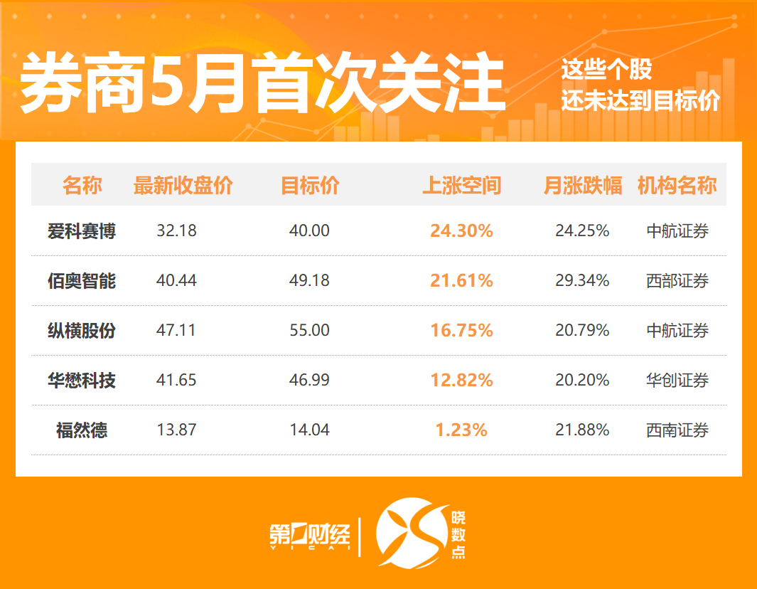 数据显示,截至5月31日,月内共有446只个股获券商首次关注。哪些行业最受券商青睐?这些个股5月以来的市场表现如何?哪些个股最具潜力? 这些个股表现强势 从5月的市场表现看,截至5月30日收盘,上述446只个股中有28只个股月内涨幅超过20%。其中,舒泰神涨超145%,潮宏基、四创电子、慧博云通等3股涨逾40%。 ![]() 具体来看,涨幅位居第一的是舒泰神,该股5月以来获财通证券首次关注,给予“增持”评级。 财通证券在研报中表示,预计公司2025~2027年营业收入分别为2.94亿元、4.48亿元、10.96亿元,归母净利润-0.76亿元、-0.56亿元、2.89亿元,PS分别为43.06倍、28.24倍、11.55倍。 此外,潮宏基获长城证券首次关注,给予“买入”评级;四创电子获方正证券、华创证券首次关注,均给予“推荐”评级。 这些个股最具潜力 在上述月内涨幅超过20%的28只个股中,有以下5只个股尚未达到券商给出的目标价。 ![]() 其中,爱科赛博的涨幅空间超24%,该股最新收盘价报32.18元,中航证券在5月18日发布的研报中给出了40元的目标价。 (文章来源:第一财经) |
