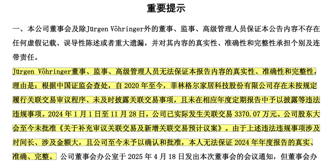 继公司业绩连续亏损、董事长质疑年报准确性后,菲林格尔(603226)实控人筹划转让控股权。 5月30日晚间,菲林格尔公告称,其实际控制人丁福如正在筹划公司股份协议转让事宜,该事项可能导致公司控制权发生变更。公司股票将于6月3日(星期二)开市起停牌,停牌时间不超过2个交易日。 ![]() 值得关注的是,菲林格尔股票提前异动,5月30日公司股票涨停,收盘价为8.22元/股,总市值为29.22亿元。 上市公司股价“提前”涨停 据披露,5月30日,丁福如通知公司,称其正在筹划公司股份协议转让事宜,该事项可能导致公司控制权发生变更。 公开资料显示,菲林格尔主营业务为木地板、全屋定制家居的研发、设计、生产及销售。公司成立于1995年,2017年在沪市主板上市。 丁福如为新加坡国籍,于1995年3月至1995年12月任公司前身新发展真空董事长,公司第一、三、四、五届董事会副董事长,现任香港亚太董事长,公司第六届董事会副董事长。 菲林格尔2025年一季报显示,其法人股东ASIA PACIFIC GROUP INTERNATIONAL LIMITED、新发展集团有限公司、广西巴马俪全饮料有限公司均系实际控制人丁福如控制的企业,上海多坤建筑工程有限公司系实际控制人之一致行动人丁佳磊持股67.06%的企业,截至报告期末,上述股东合计持有上市公司1.58亿股,占公司总股本44.56%。 值得关注的是,公司于5月30日晚间披露上述筹划股份协议转让的公告,但在当日交易时段,菲林格尔股票已涨停。近几日,公司并未披露其他可能影响股价的重大变动公告,这一情况也引发市场关注与讨论。 而菲林格尔近期出现多名股东减持。5月8日,菲林格尔公告称,其持股5%以上股东菲林格尔控股、公司总经理刘敦银、公司副总经理陶媛和吉富堂分别计划减持不超过公司股份的3%、0.19%、0.09%、0.08%。其中,菲林格尔控股的管理董事为菲林格尔董事长Jürgen Vhringer。 ![]() 与此同时,菲林格尔的前十大股东榜发生变化。据公司2025年一季报,公司第八大股东J.P.Morgan Securities PLC-自有资金、第九大股东张霞、第十大股东上海子午投资管理有限公司-子午汇宏二号私募证券投资基金均为新进股东,分别持有上市公司0.65%、0.6%、0.49%的股权。而公司前十大股东赵广军则较此前增持了公司0.22%的股份。 ![]() 根据公告,J.P.Morgan Securities PLC-自有资金为境外法人,上海子午投资管理有限公司-子午汇宏二号私募证券投资基金为境内非国有法人,张霞为境内自然人。企查查资料显示,上海子午投资管理有限公司成立于2013年,注册资本为1亿元。 上市公司业绩连续下滑 菲林格尔频频受到股东减持,与公司连年业绩下滑有关。 据披露,2020年至2024年,公司业绩持续下滑。其中,2023年与2024年转为亏损,归母净利润分别为-2418.43万元、-3730.71万元。 ![]() 菲林格尔表示,公司拥有与房地产强关联的行业背景,日常经营受到宏观经济及周边行业的周期性等因素影响,各项业务均受到不同程度影响,主要数据指标均承压下滑。2025年公司业绩延续颓势,一季度公司归母净利润为-1367.08万元。 ![]() 此外,公司的IPO募投项目数次延期也遭到质疑。公告显示,根据最新进展,公司决定将“上海菲林格尔木业股份有限公司改扩建项目”和“企业信息化建设项目”达到预定可使用状态的时间延期至2025年8月。 ![]() 对于未达到计划进度的原因,公司称,其中的改扩建项目厂房基建部分已组织验收,设备部分已基本购置。目前,尚有部分设备仍处于紧张调试阶段,待所有设备调试成功且生产线稳定运行后,将启动验收工作。按照相关合同进度,剩余部分合同金额尚未支付,未能达到预期进展。 董事长称公司年报无法“保真” 上市公司业绩恶化的同时,还深陷内部管理失控、股东“内斗”不断等问题。 菲林格尔德国籍董事长Jürgen Vhringer在2024年年报中表示,无法保证本报告内容的真实性、准确性和完整性。而这已经是他第二次对公司年报表示“无法保证”。 ![]() 年报显示,董事长对公司年报表示“不保真”,主要与公司的一笔关联交易不规范有关。根据中国证监会查处,自2020年至今,菲林格尔存在未按规定履行关联交易审议程序、未及时披露关联交易事项,且未在相应年度定期报告中予以披露等违法违规事项。2024年1月1日至11月28日,公司已实际发生关联交易3370.07万元。公司股东大会至今未批准《关于补充审议关联交易及新增关联交易预计议案》。 对此,公司董事长Jürgen Vhringer认为,由于上述违法违规事项涉及时间长、涉及金额大,且公司至今未予以确认和批准,其无法保证2024年年度报告的真实、准确、完整。 与此同时,2025年4月22日,公司收到实际控制人提议增加临时议案。经核实,该项议案涉及公司与实际控制人之间的关联交易事项,但相关各方此前并未就该议案的内容进行过任何沟通与确认。24小时后,实际控制人提议暂缓审议并撤销该议案。 Jürgen Vhringer提出,临时议案的提出与撤销的随意性太强,变化太快,导致其无法确认本次董事会会议的严肃性。他本人无法保证本次董事会会议审议的2024年年度报告的真实、准确、完整。 这份被董事长出具“不保真”意见的年报,还收到了审计机构出具的“非标”意见。 2024年9月,因工程建设事项关联交易不规范,上海证监局对公司采取责令改正的监督管理措施,对实际控制人、副董事长丁福如和监事会主席范斌分别采取出具警示函的监督管理措施。 基于