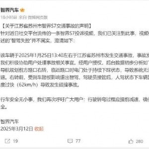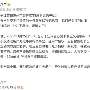 格隆汇3月13日|智界汽车3月12日发布声明称,针对近日社交平台流传的一条智界S7投诉视频,其已关注到此事,视频中所表述的“智驾失控”并不属实。该车辆于2025 ...